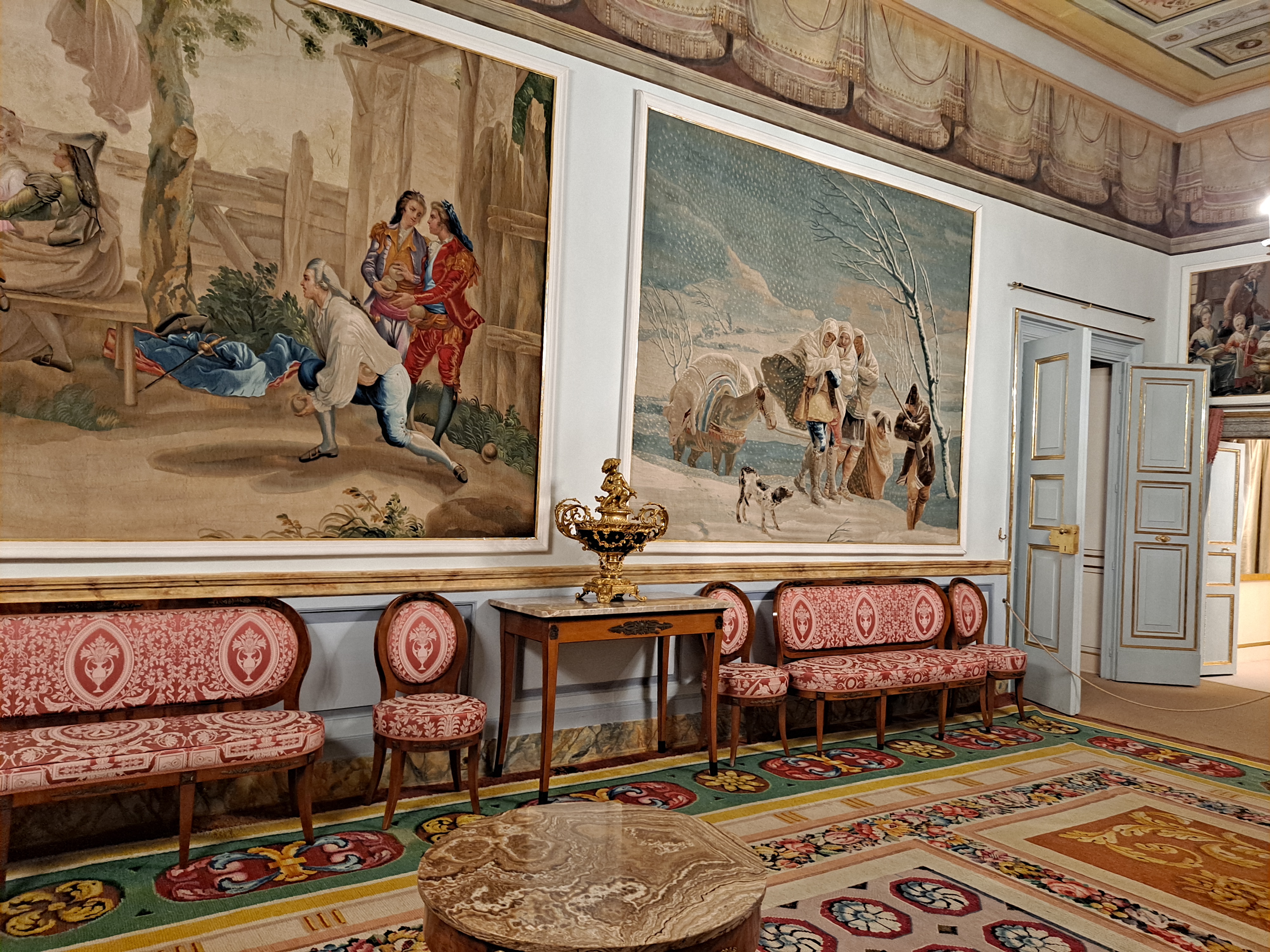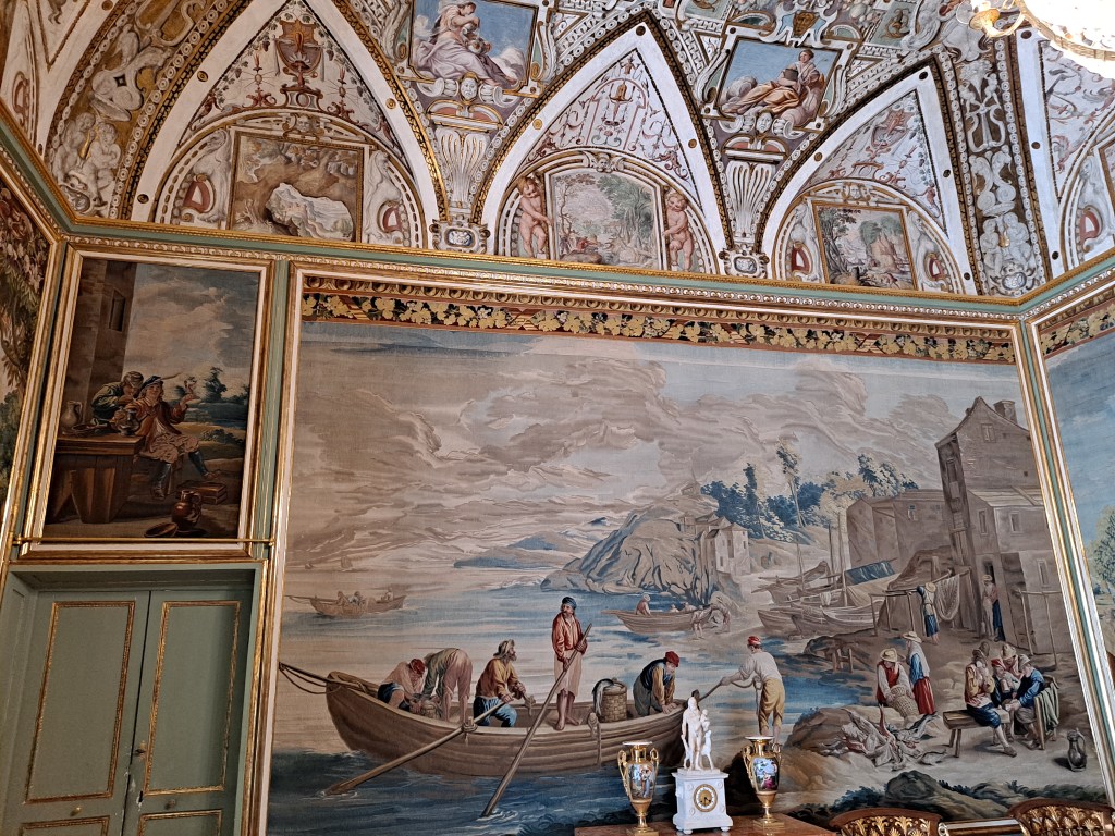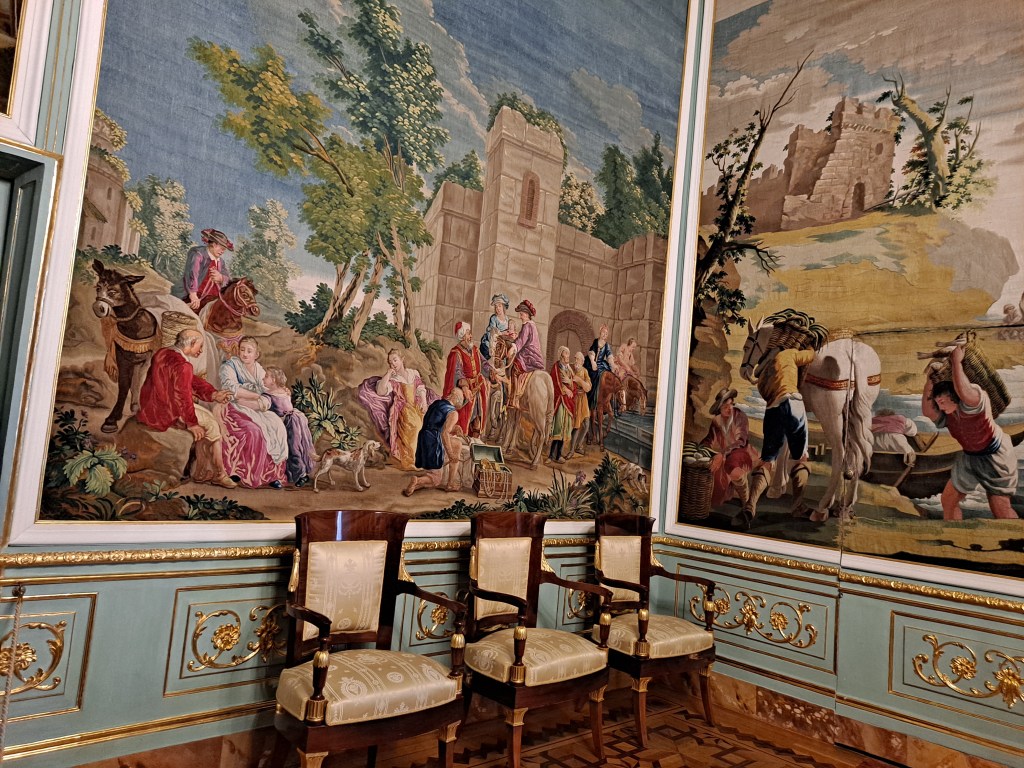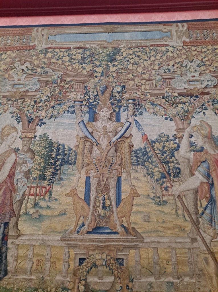 Tapices de inspiración flamenca, con escenas emulando la historia griega, también con imágenes de caza, y escenas cotidianas del ocio aristocrático.