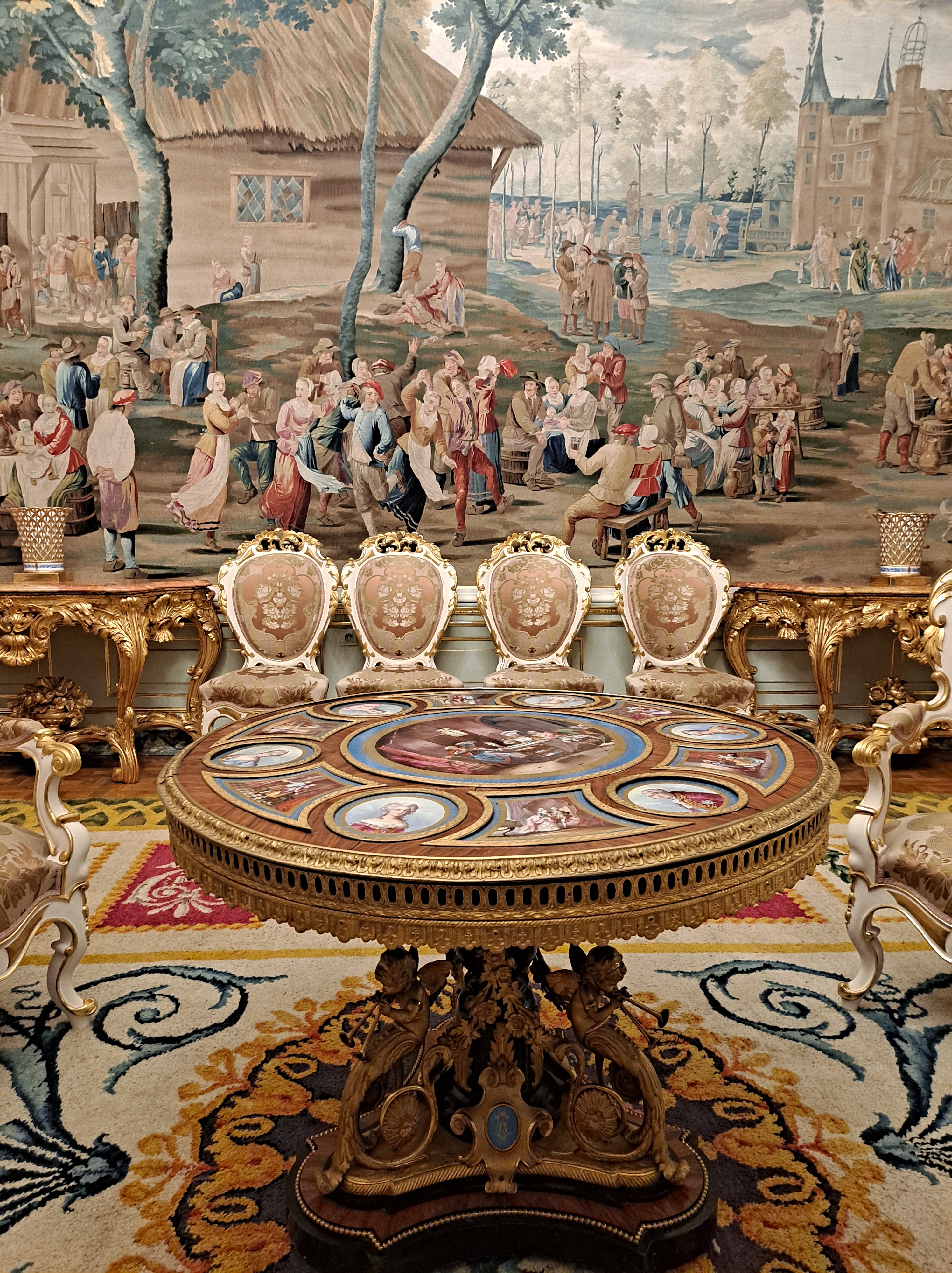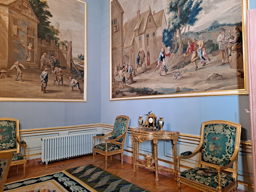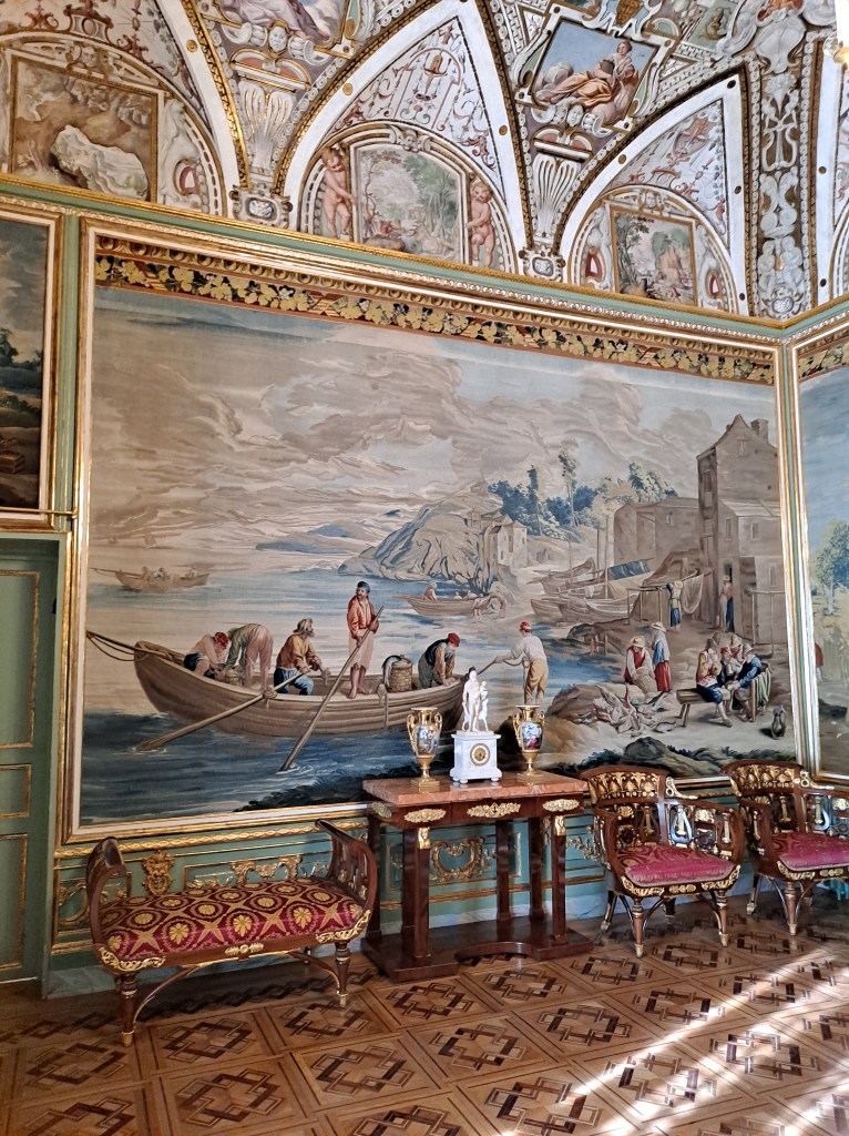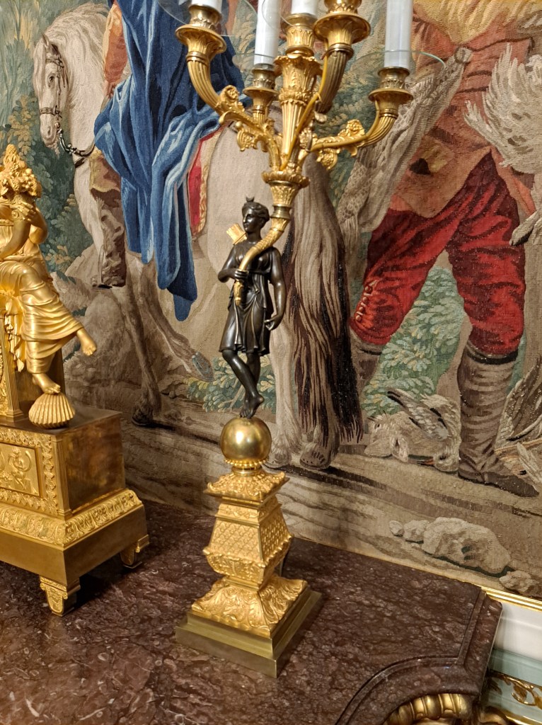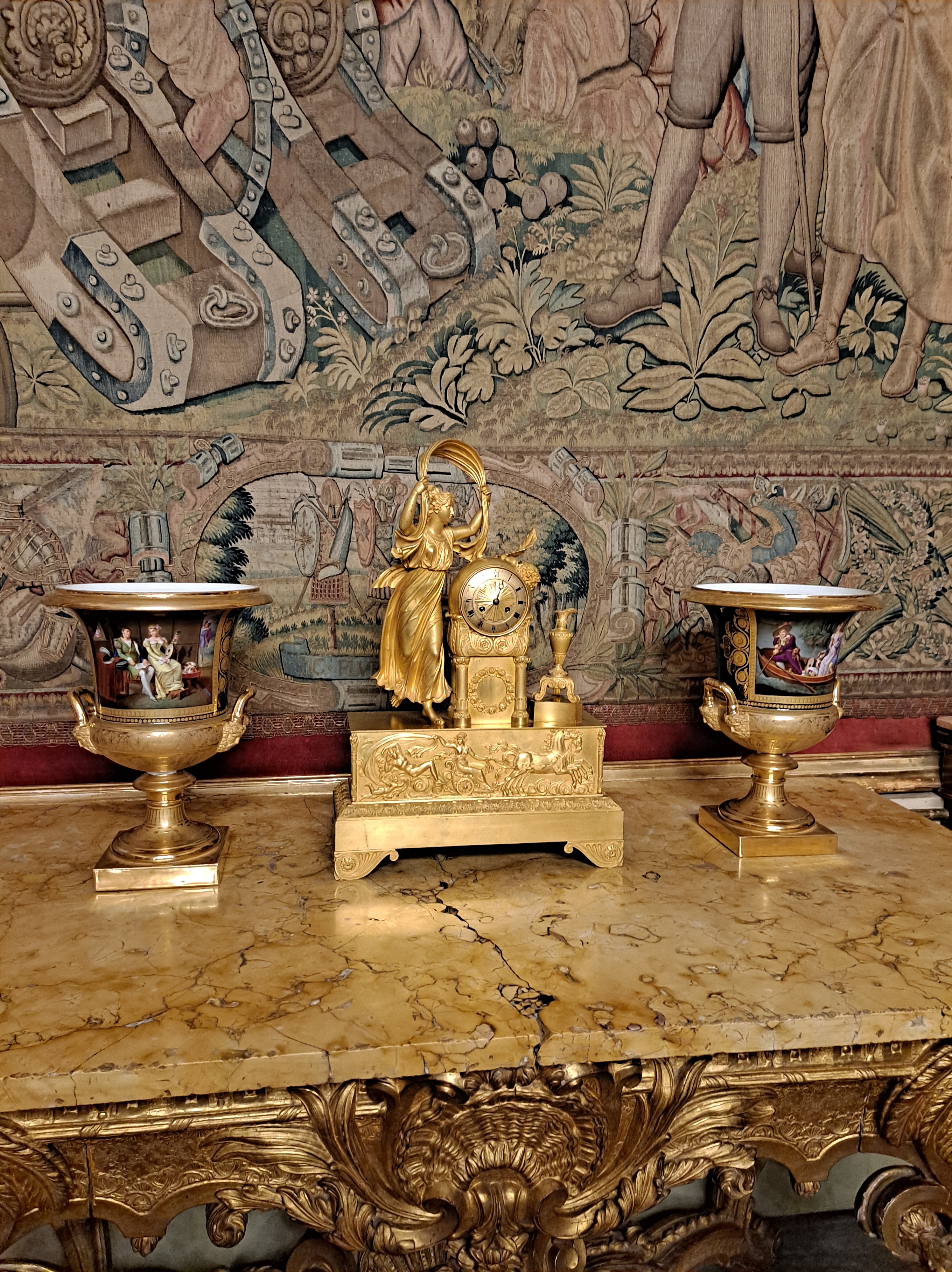 Tapices de inspiración flamenca, con escenas emulando la historia griega, también con imágenes de caza, y escenas cotidianas del ocio aristocrático.