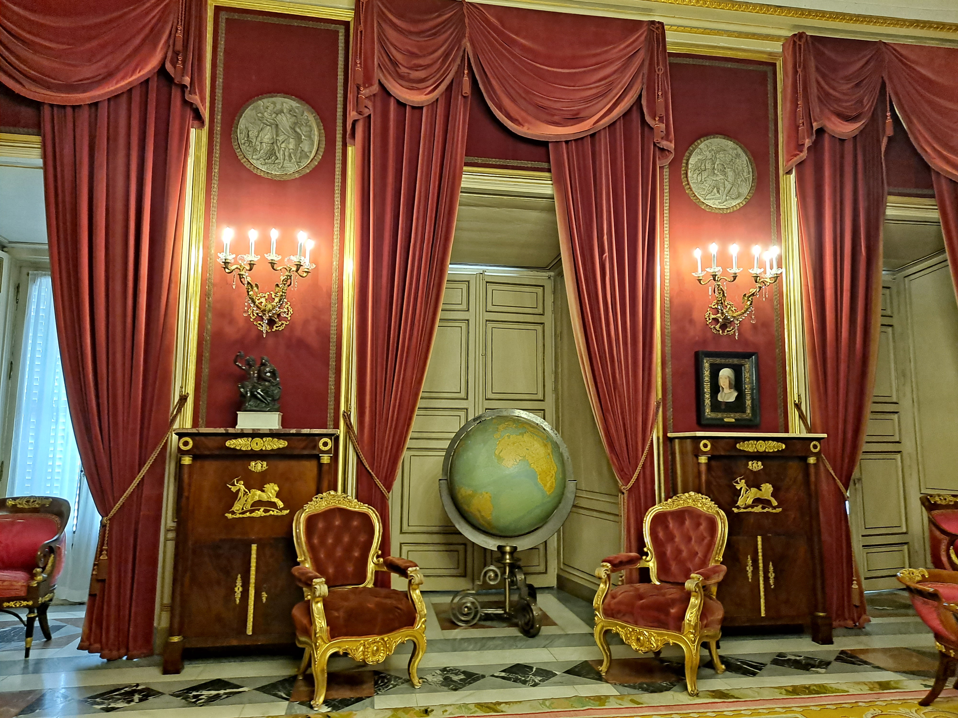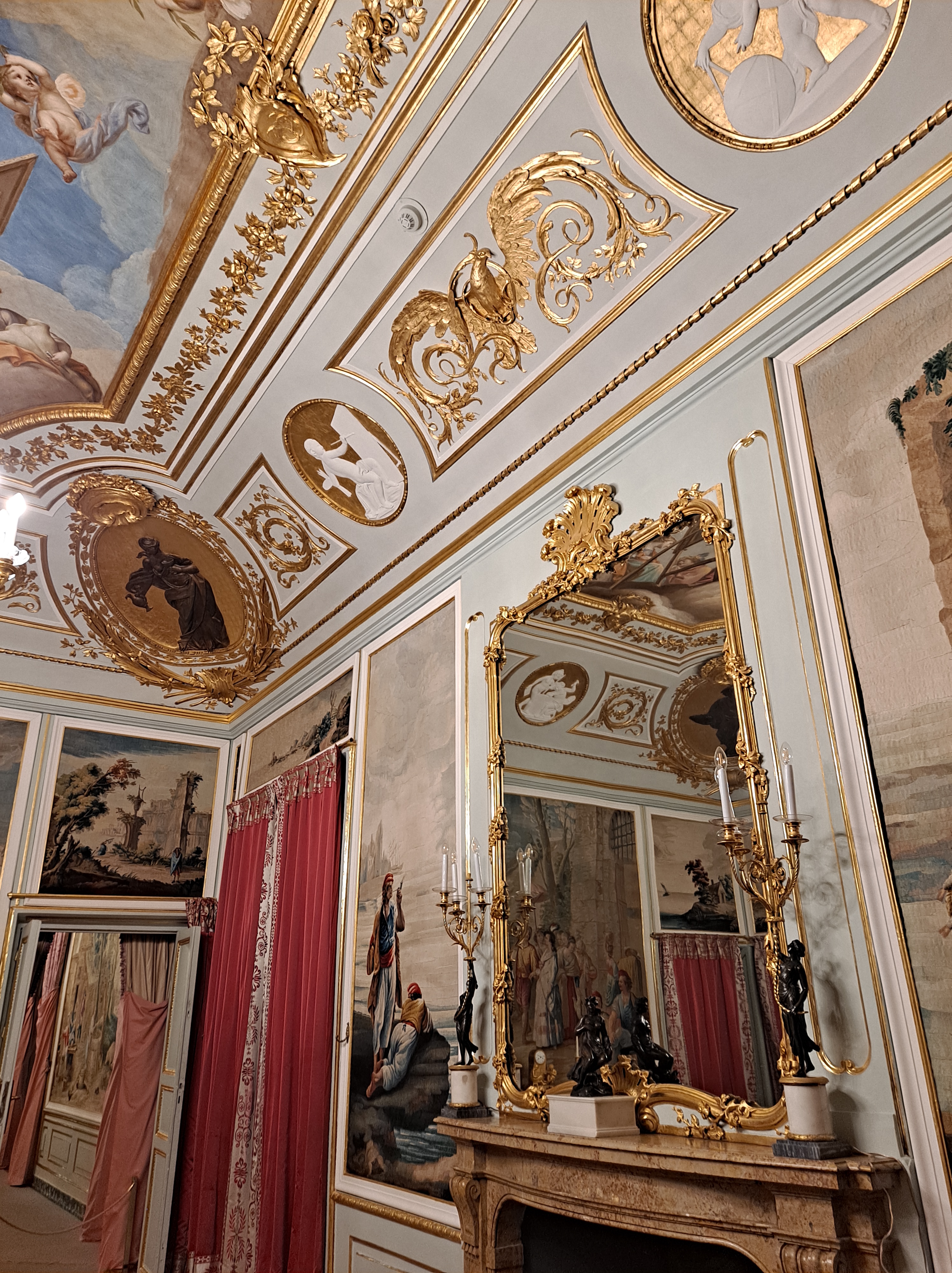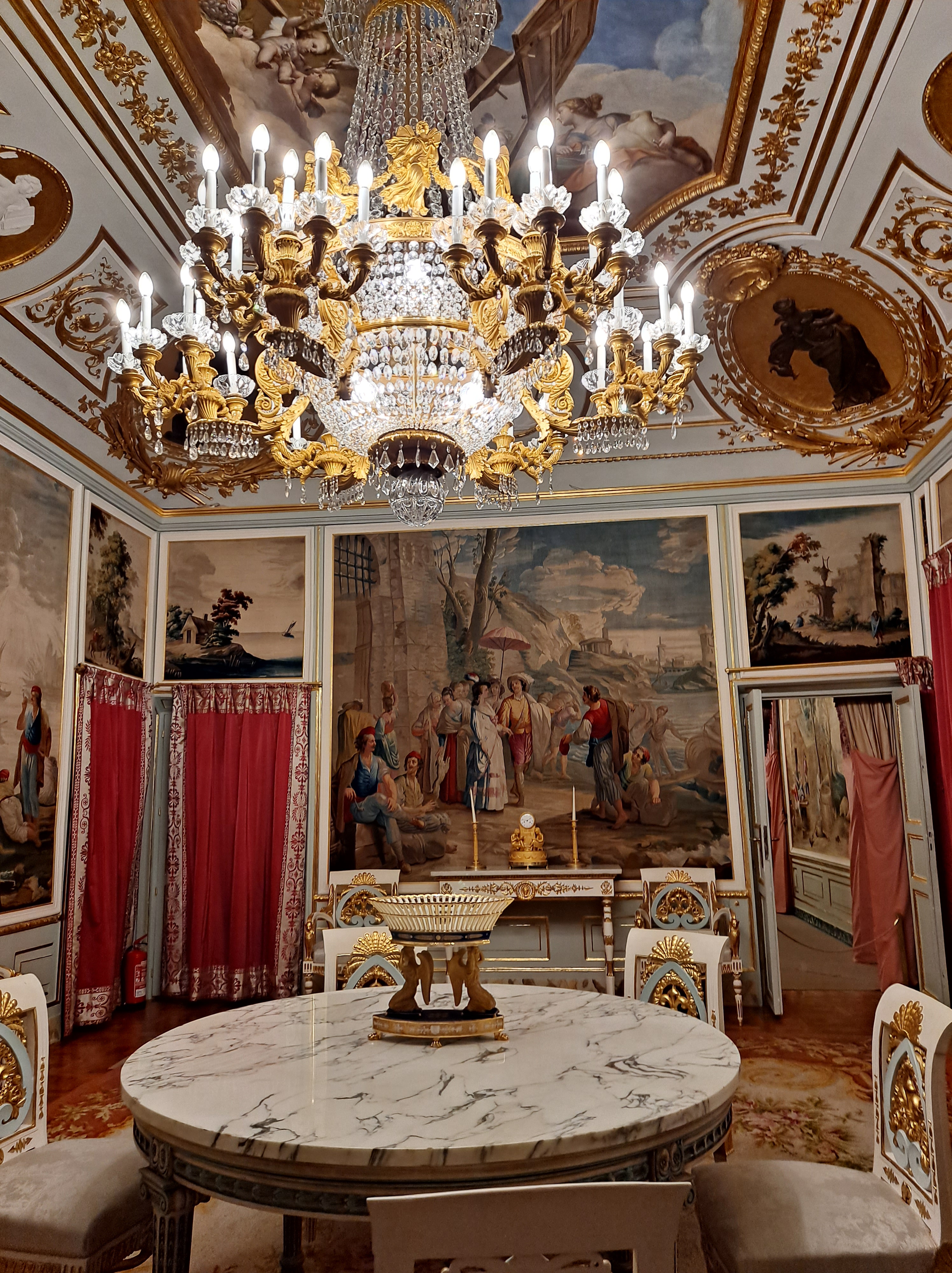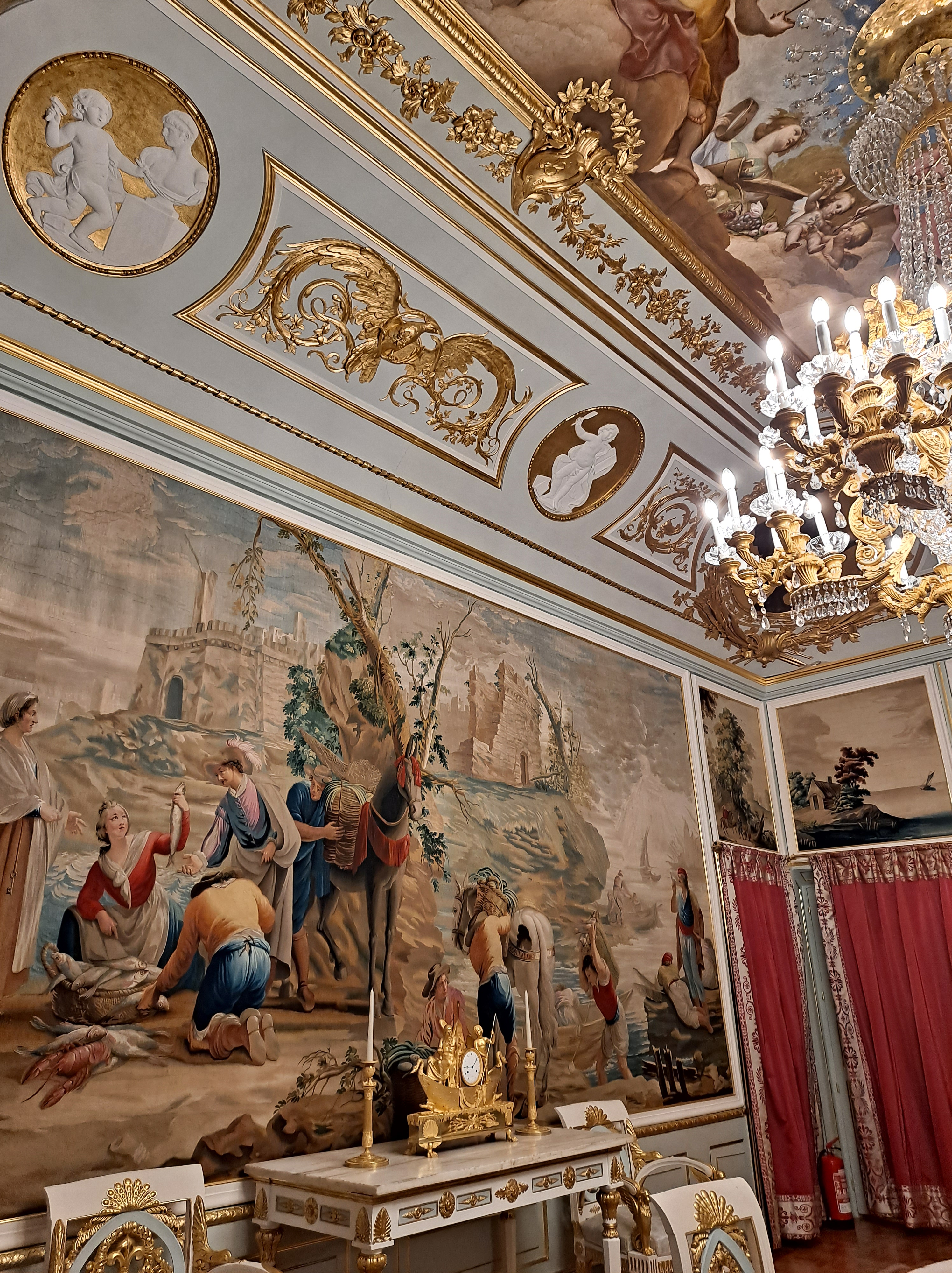 Casi todas las salas tienen el techo con frescos y sinuosas lámparas parisinas, e italianas, las puertas altas con acabados pintorescos, millones de tapices y alfombras.