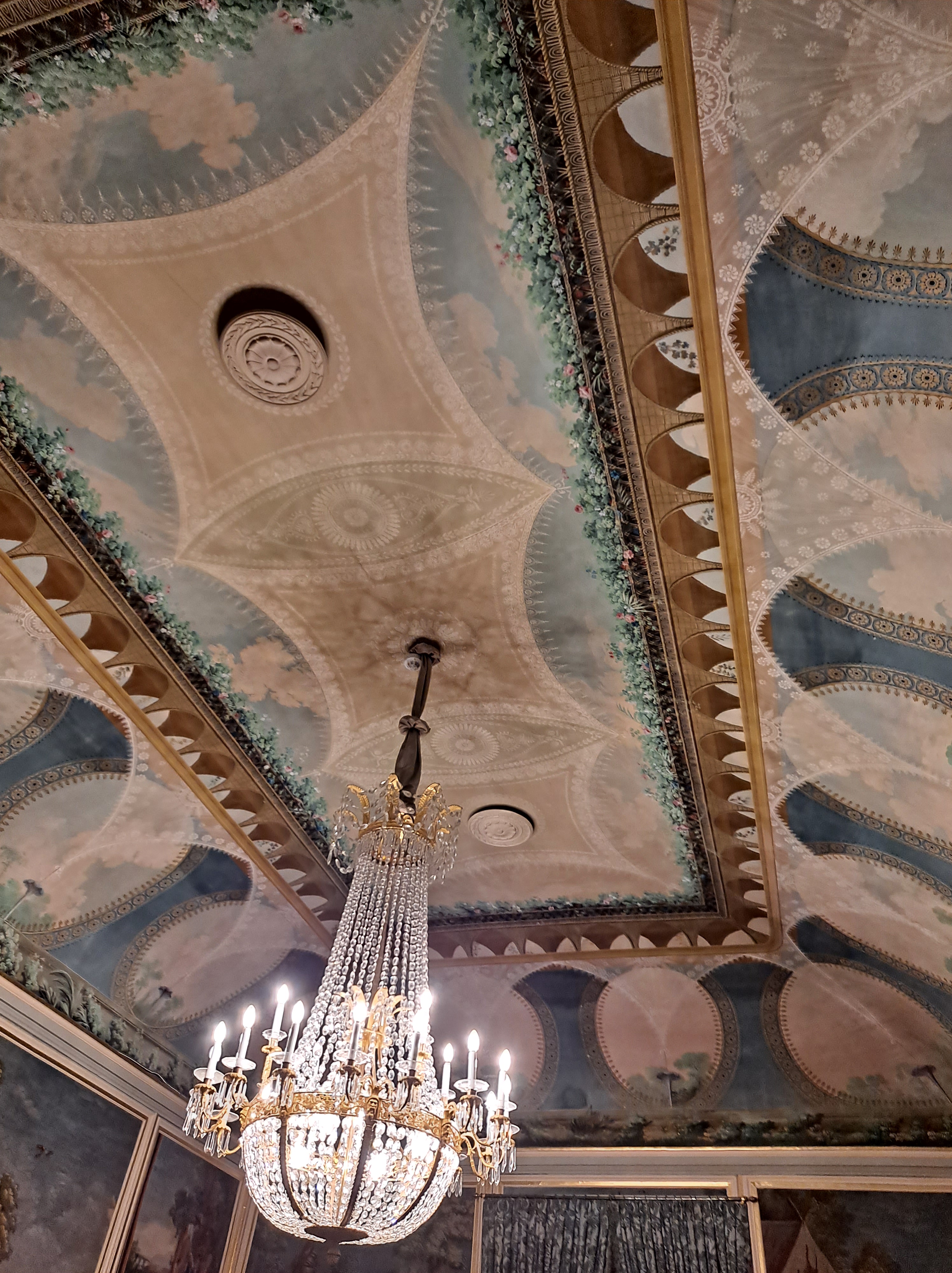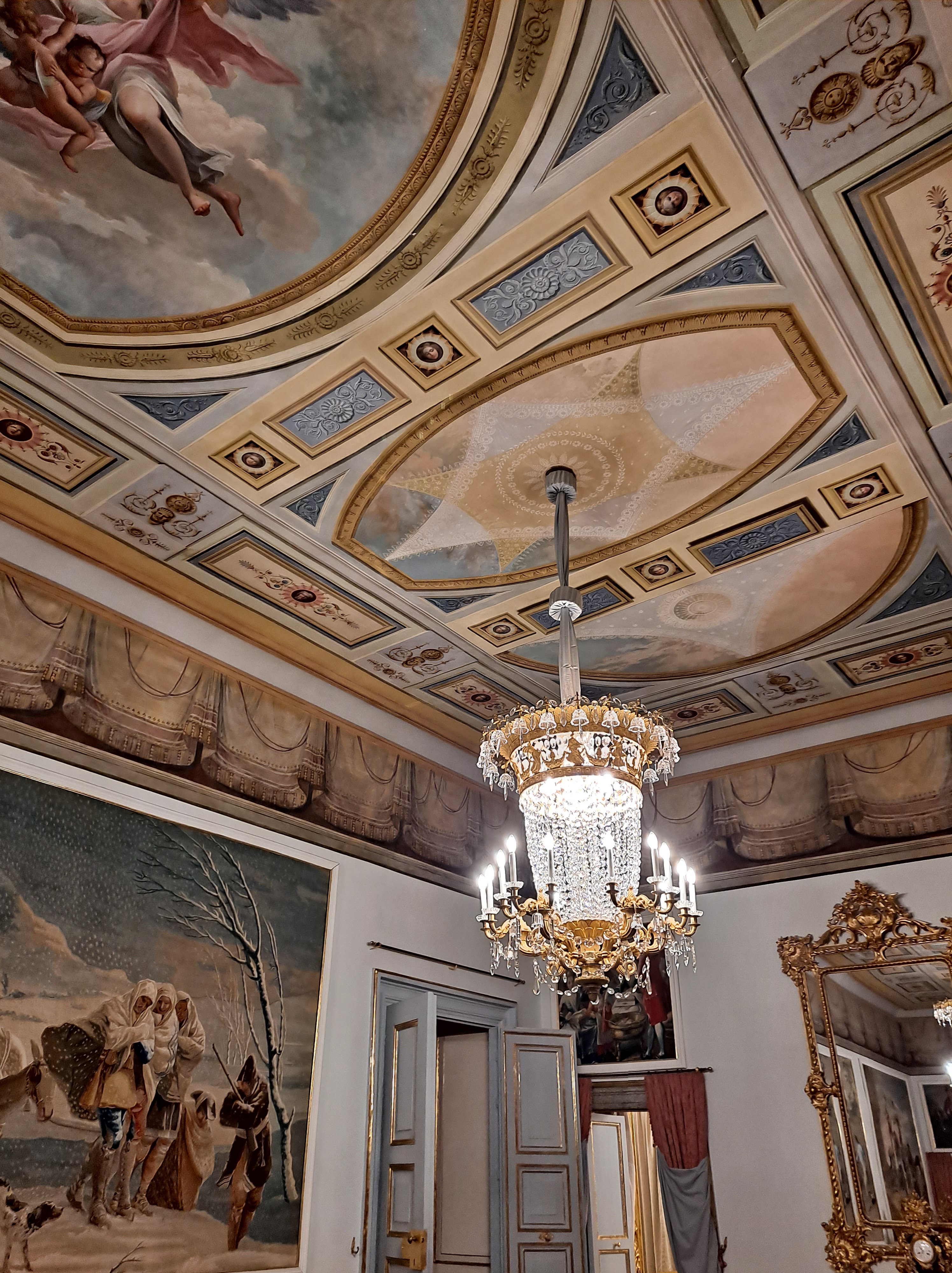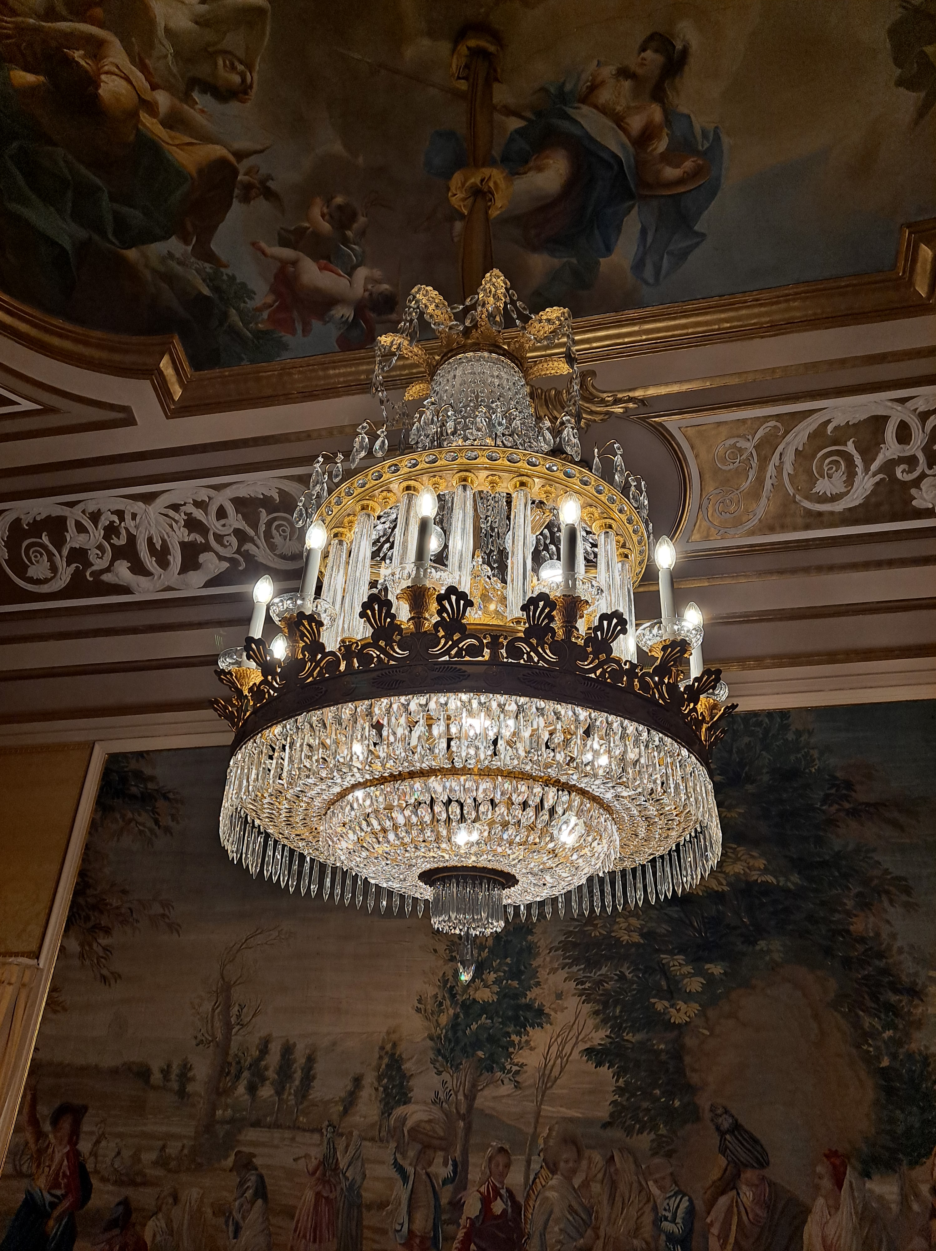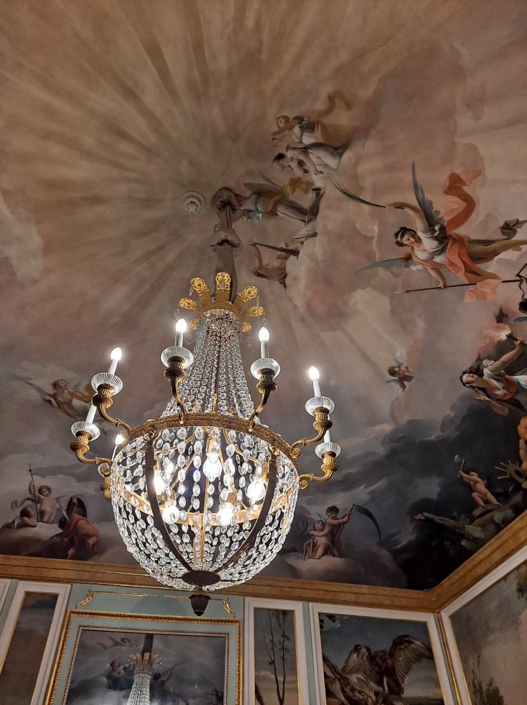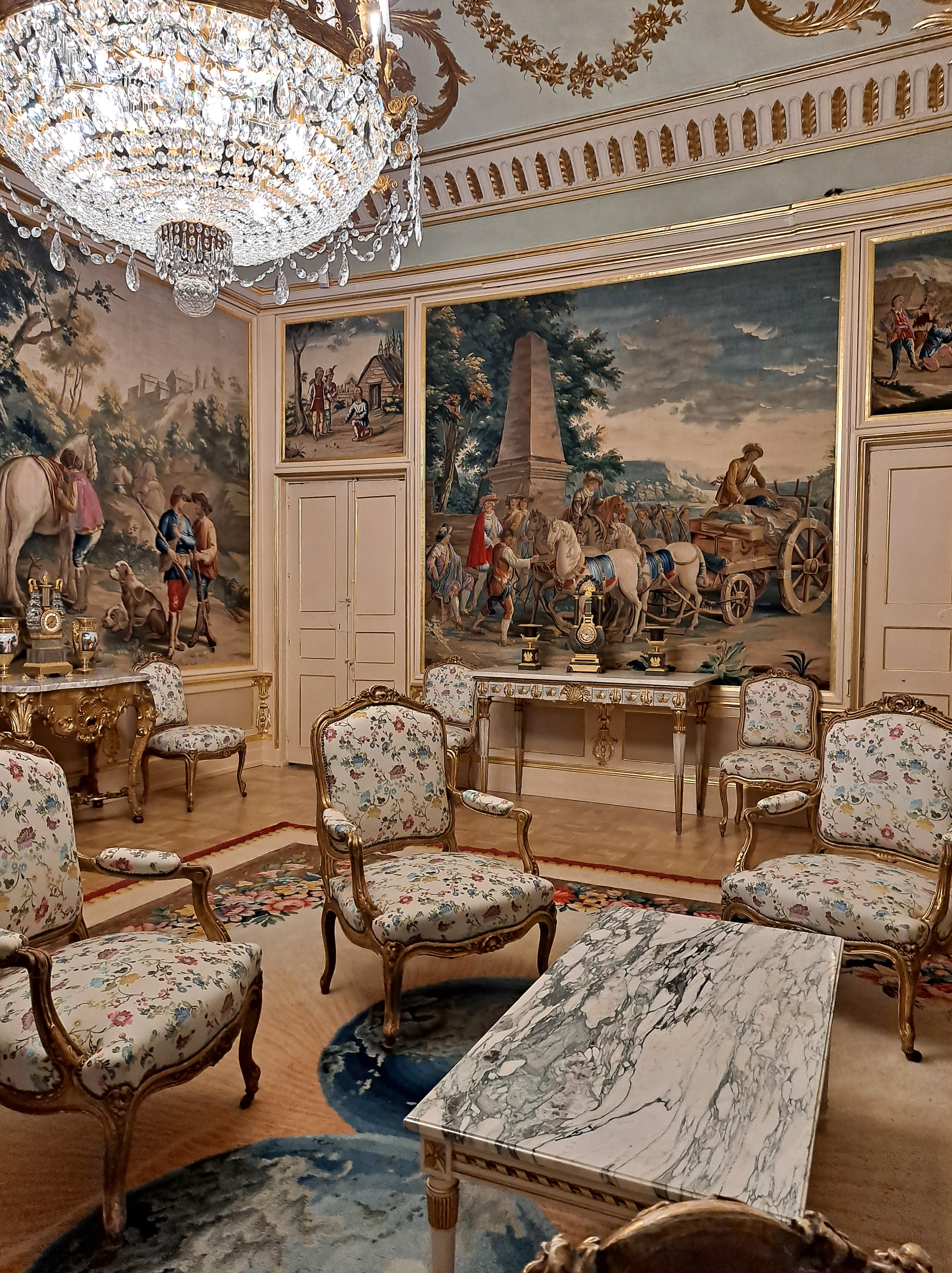 Casi todas las salas tienen el techo con frescos y sinuosas lámparas parisinas, e italianas, las puertas altas con acabados pintorescos, millones de tapices y alfombras.