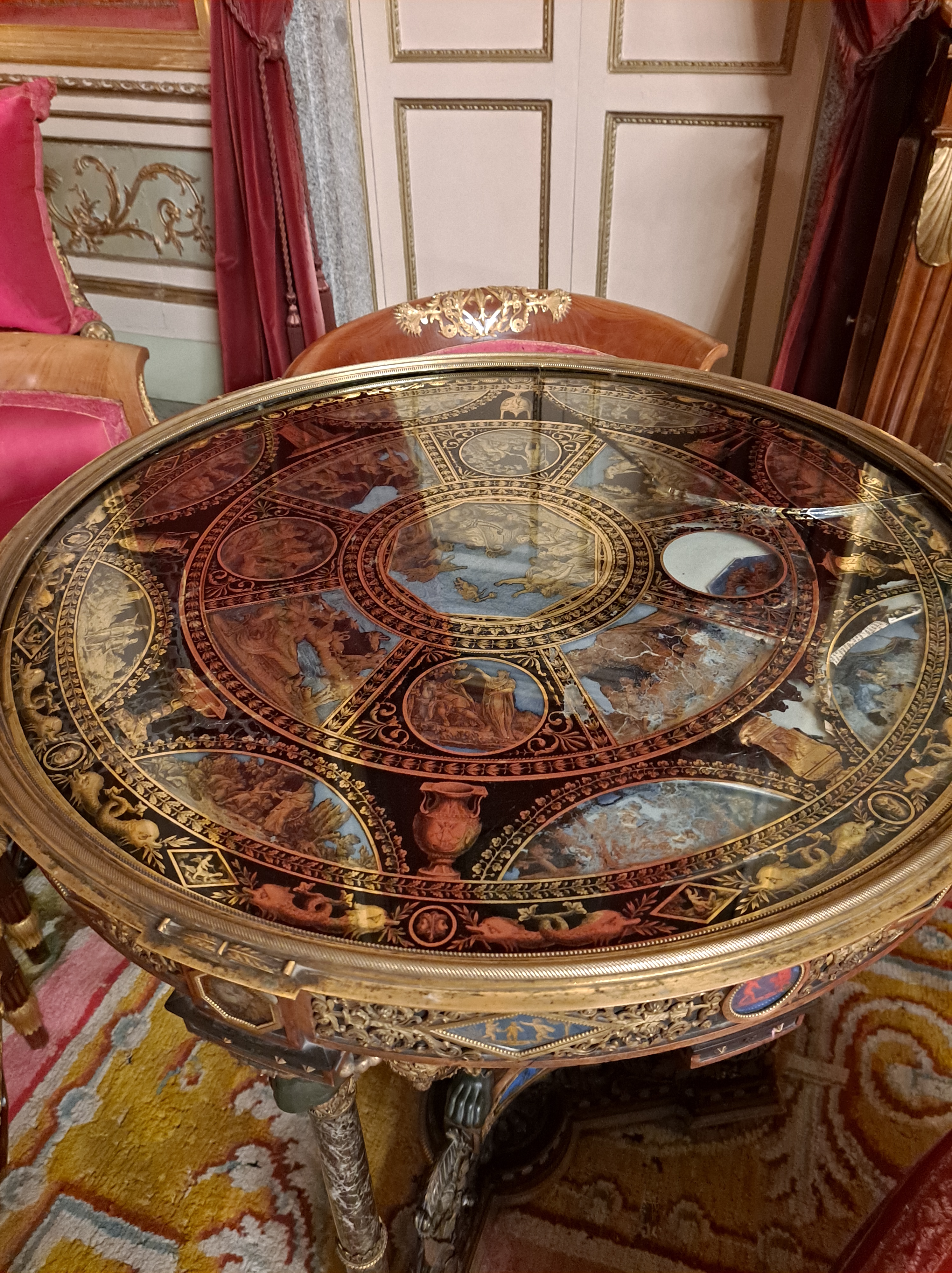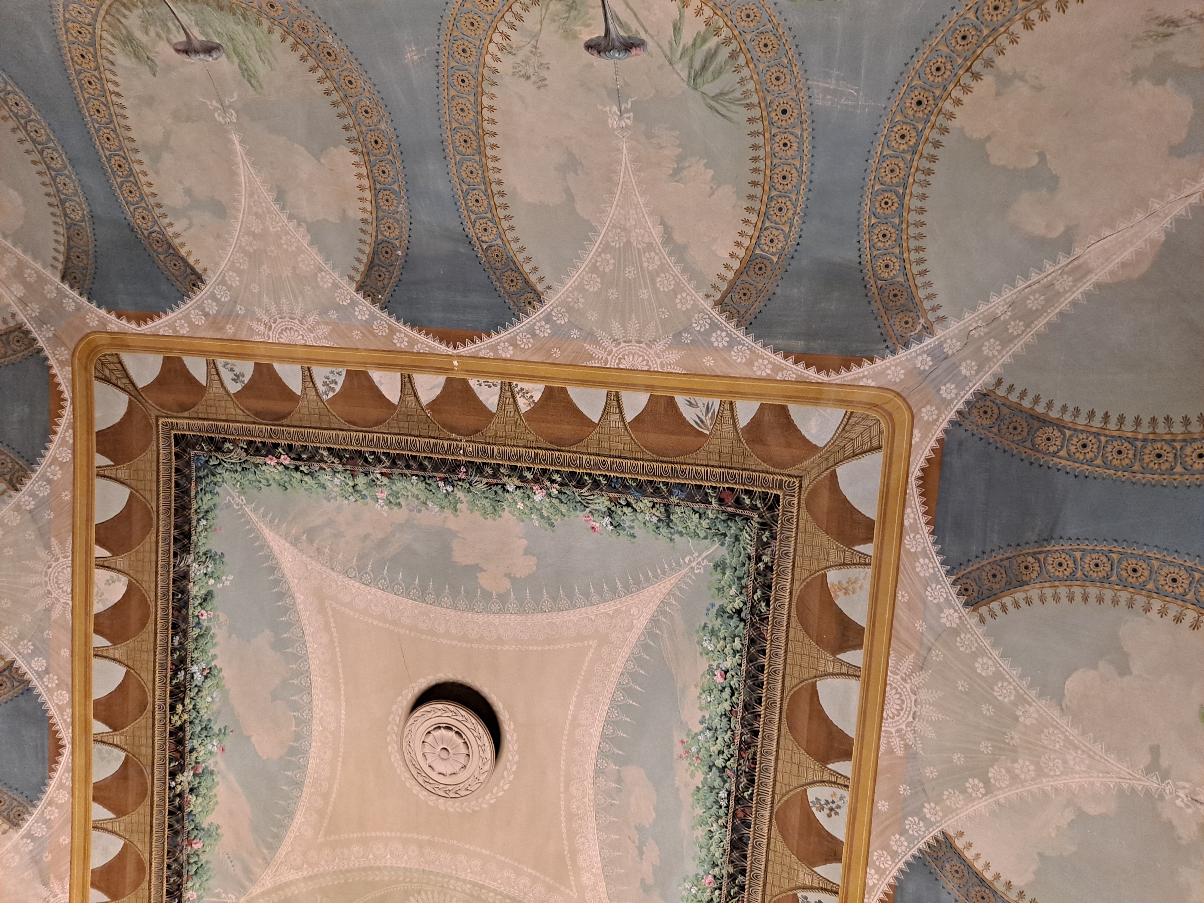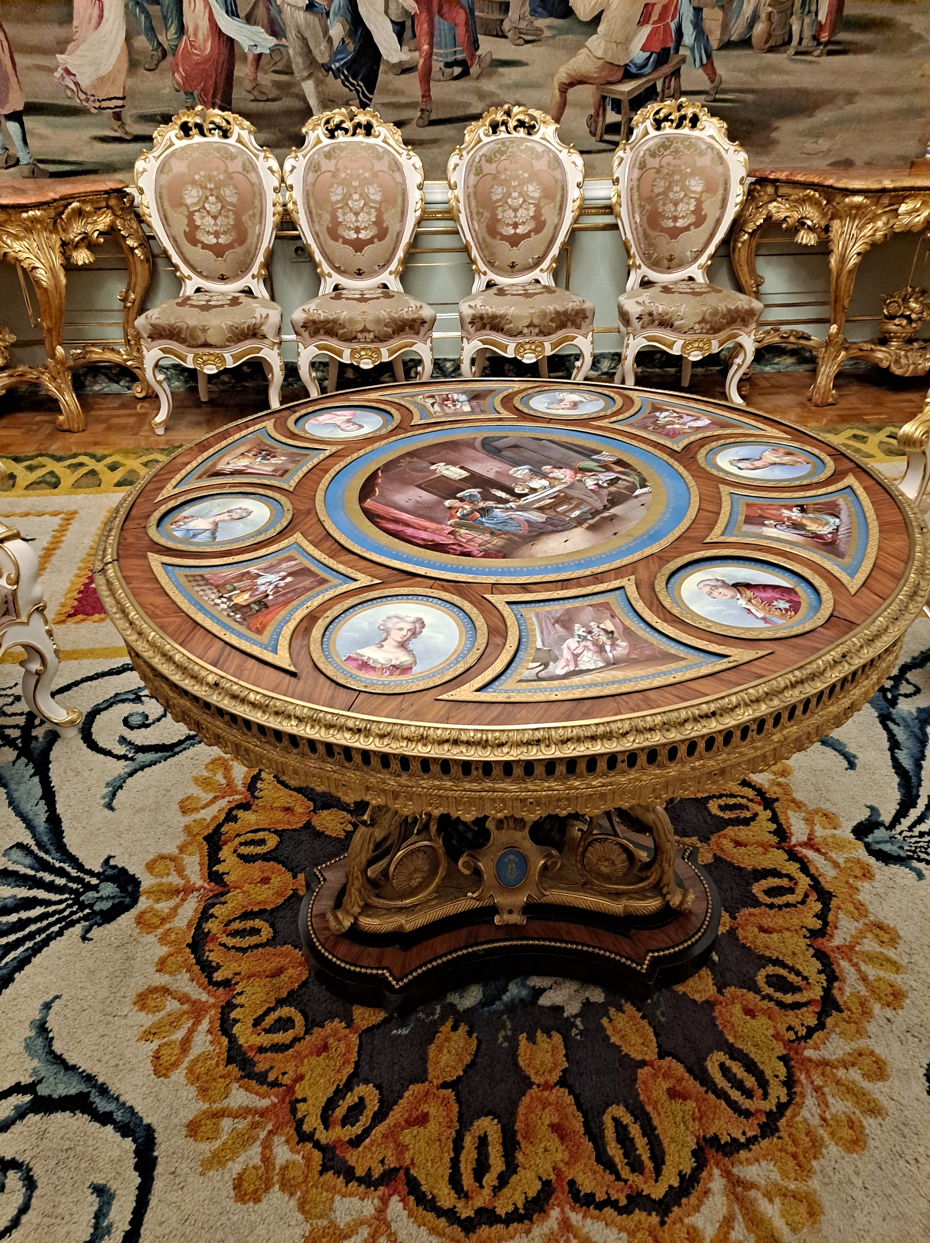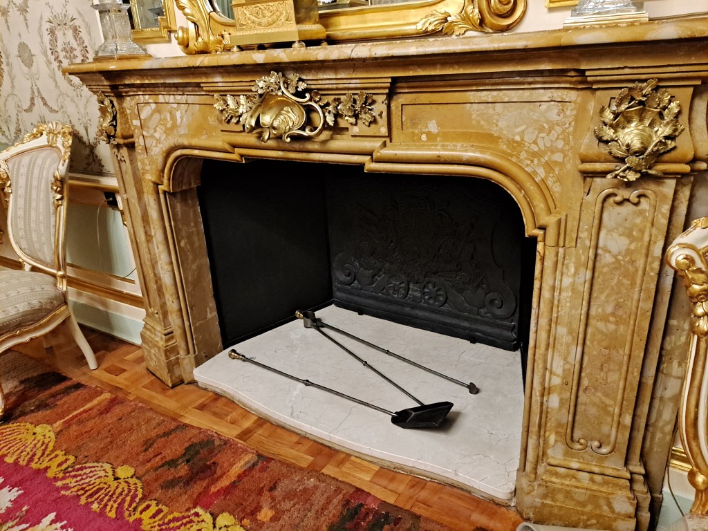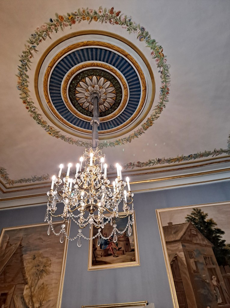 Casi todas las salas tienen el techo con frescos y sinuosas lámparas parisinas, e italianas, las puertas altas con acabados pintorescos, millones de tapices y alfombras.