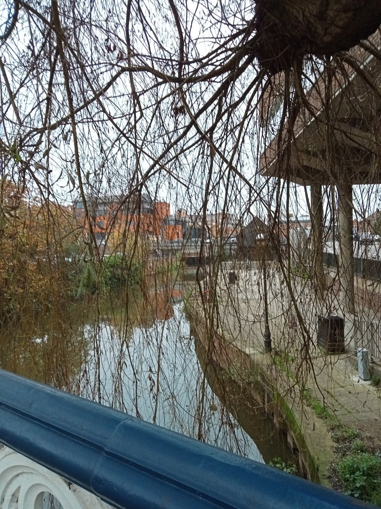 Estaba despejado y tenía casi calor pero bueno, en el tren de camino al pueblo vamos descubriendo los parajes, campos verdes, llanos, zonas industriales, arboles creciendo salvajes casi invadiendo las vias y por tanto parecía que podías sacar la mano y tocarlos.