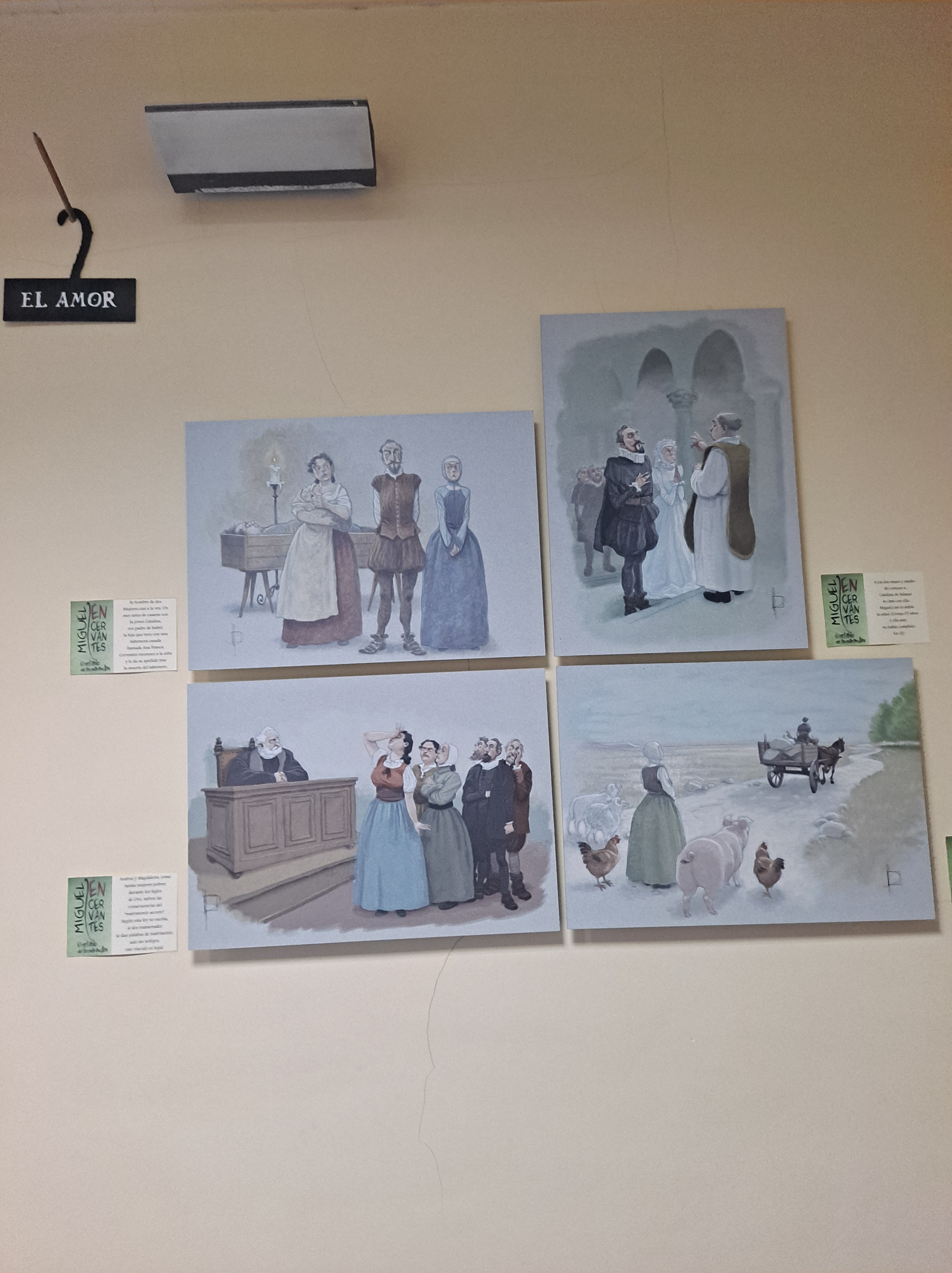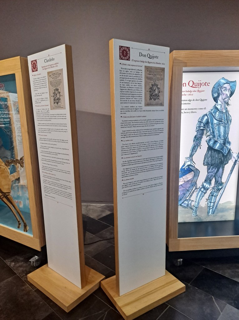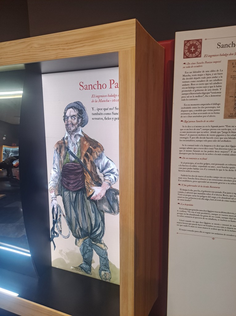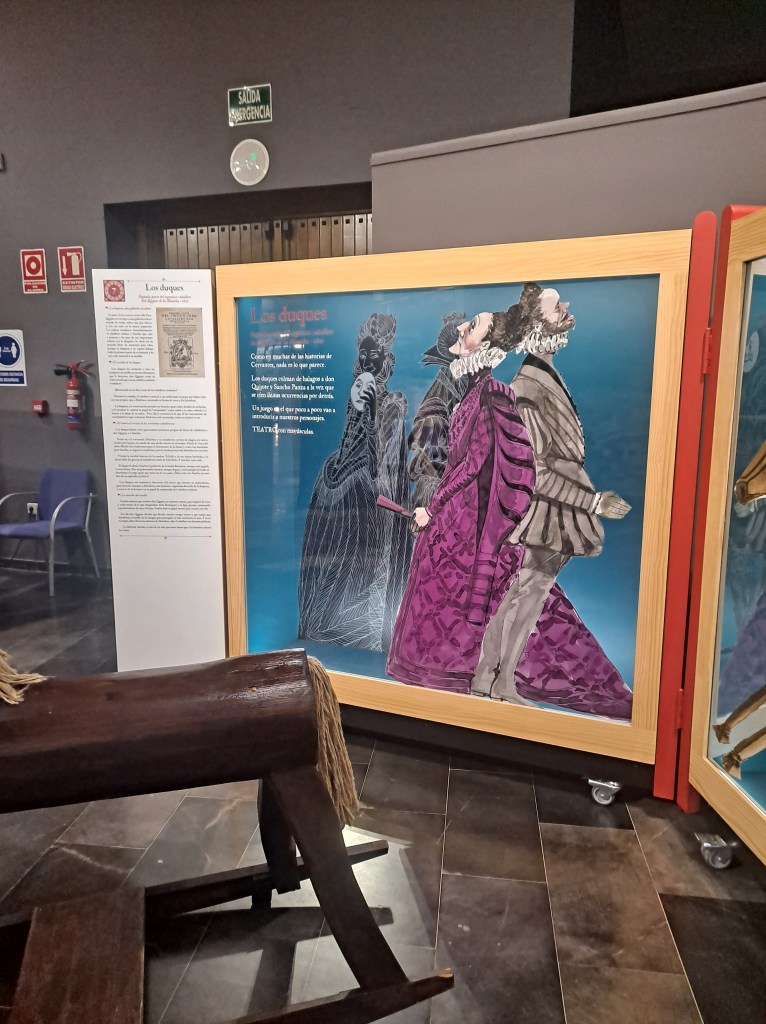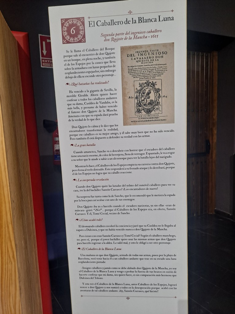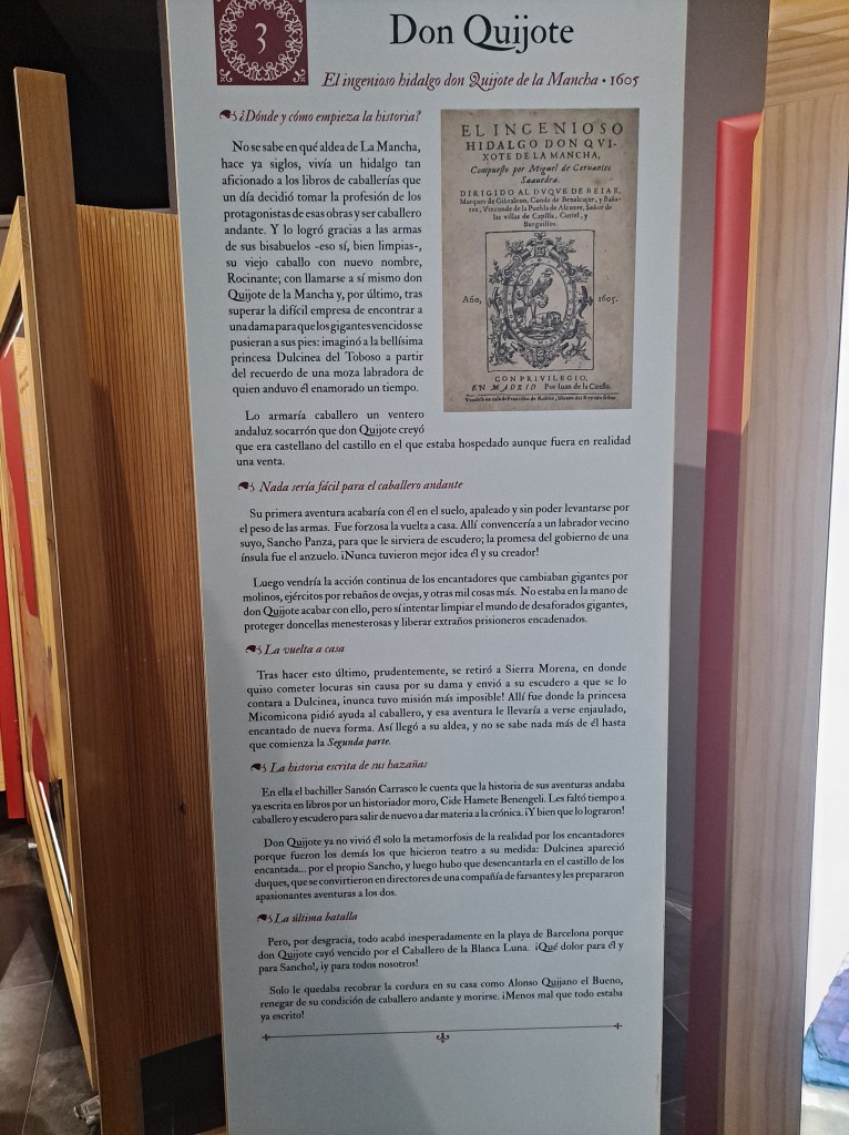 Luego hay una sala para sentarse que ponen un decorado en el suelo de arena y libros, y estanterías llenas de libros en las paredes, y una proyección en audio de un resumen del Quijote.