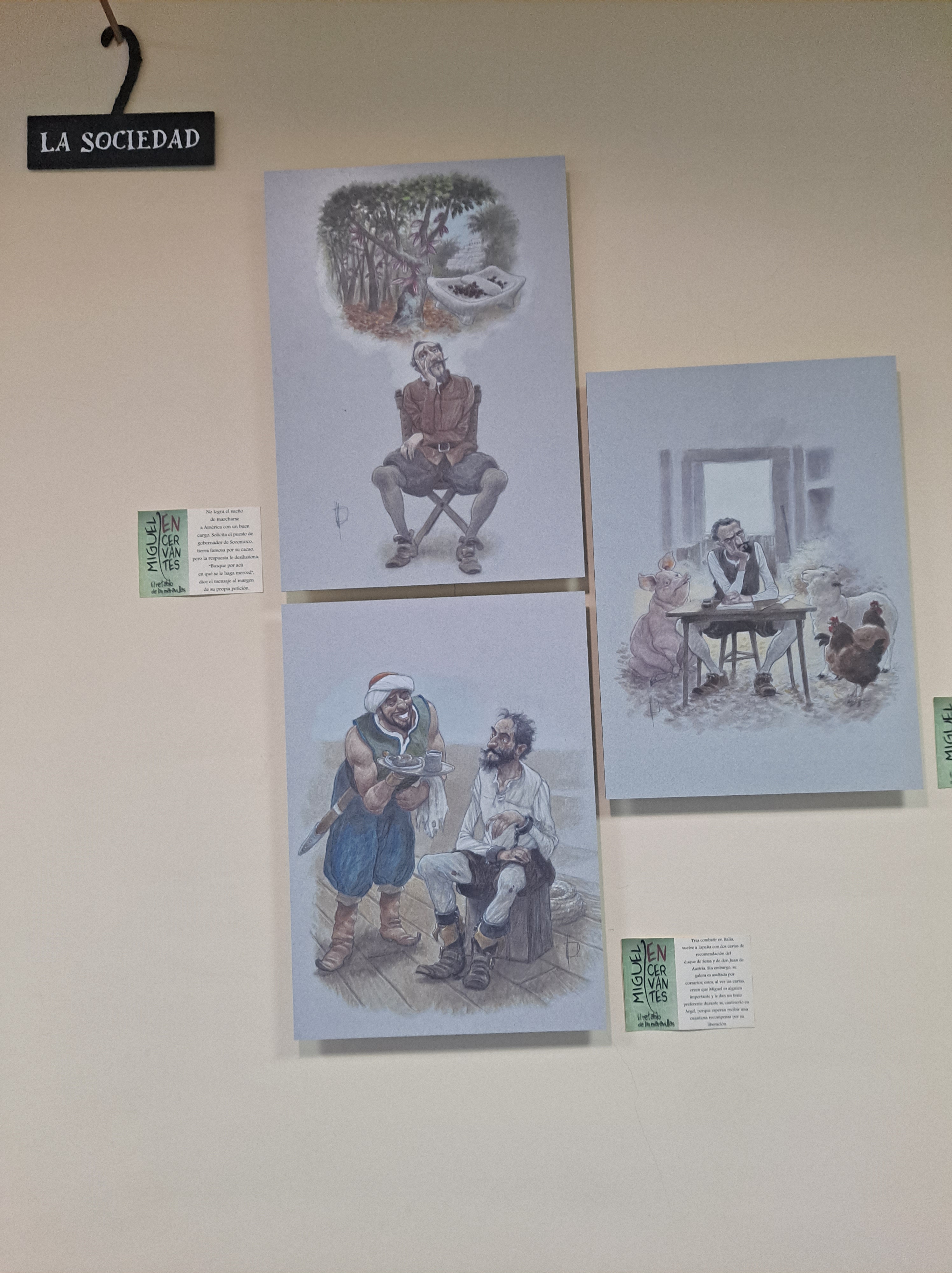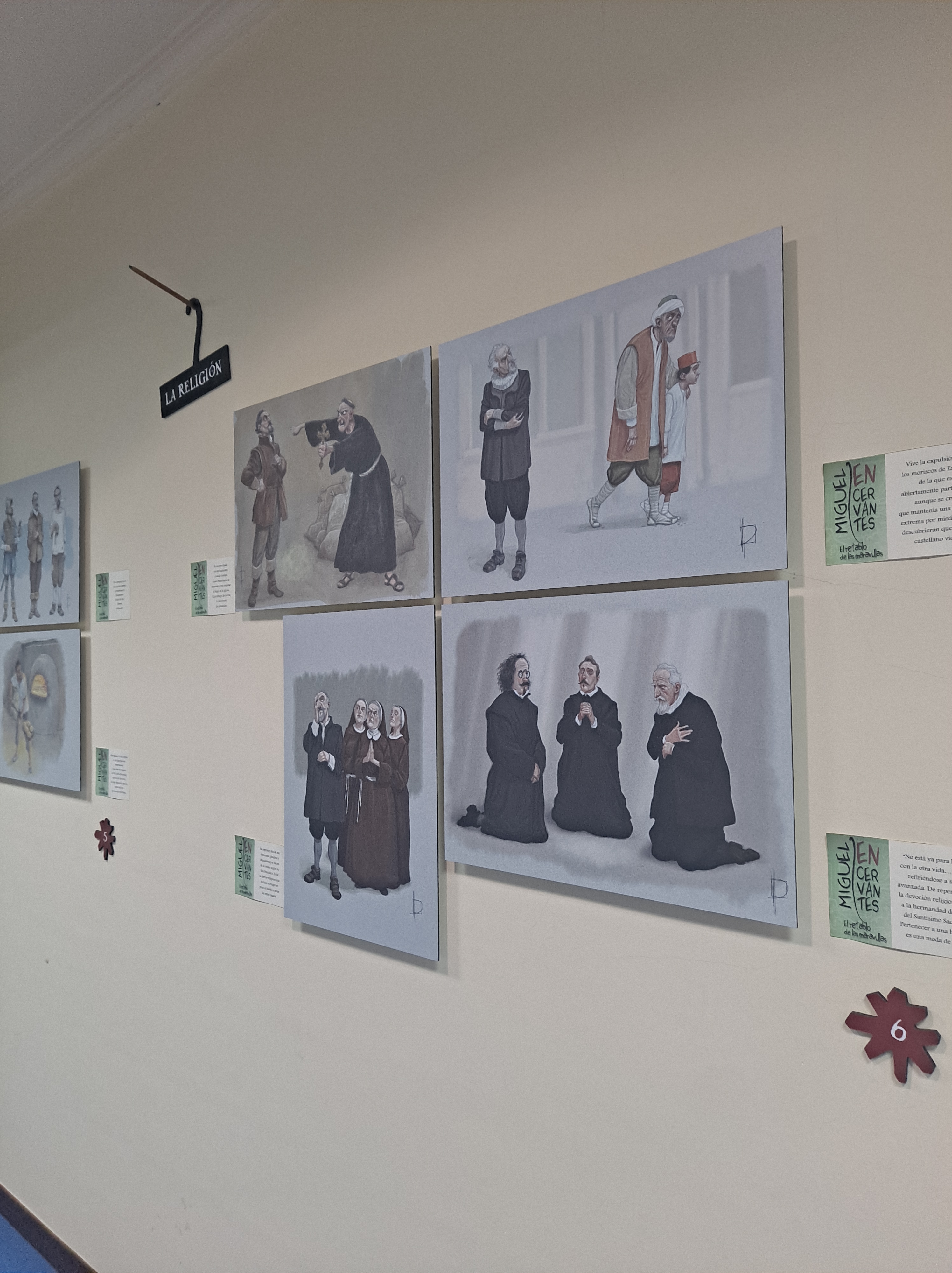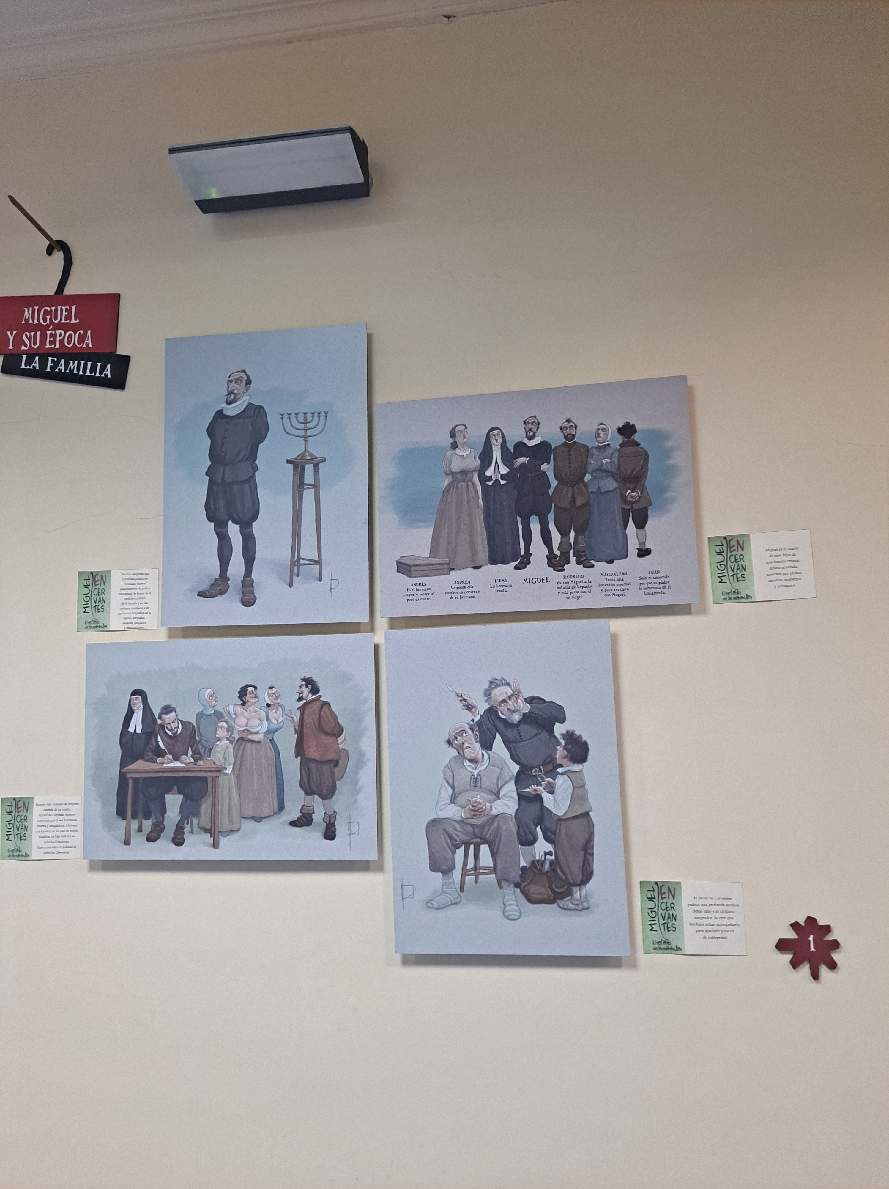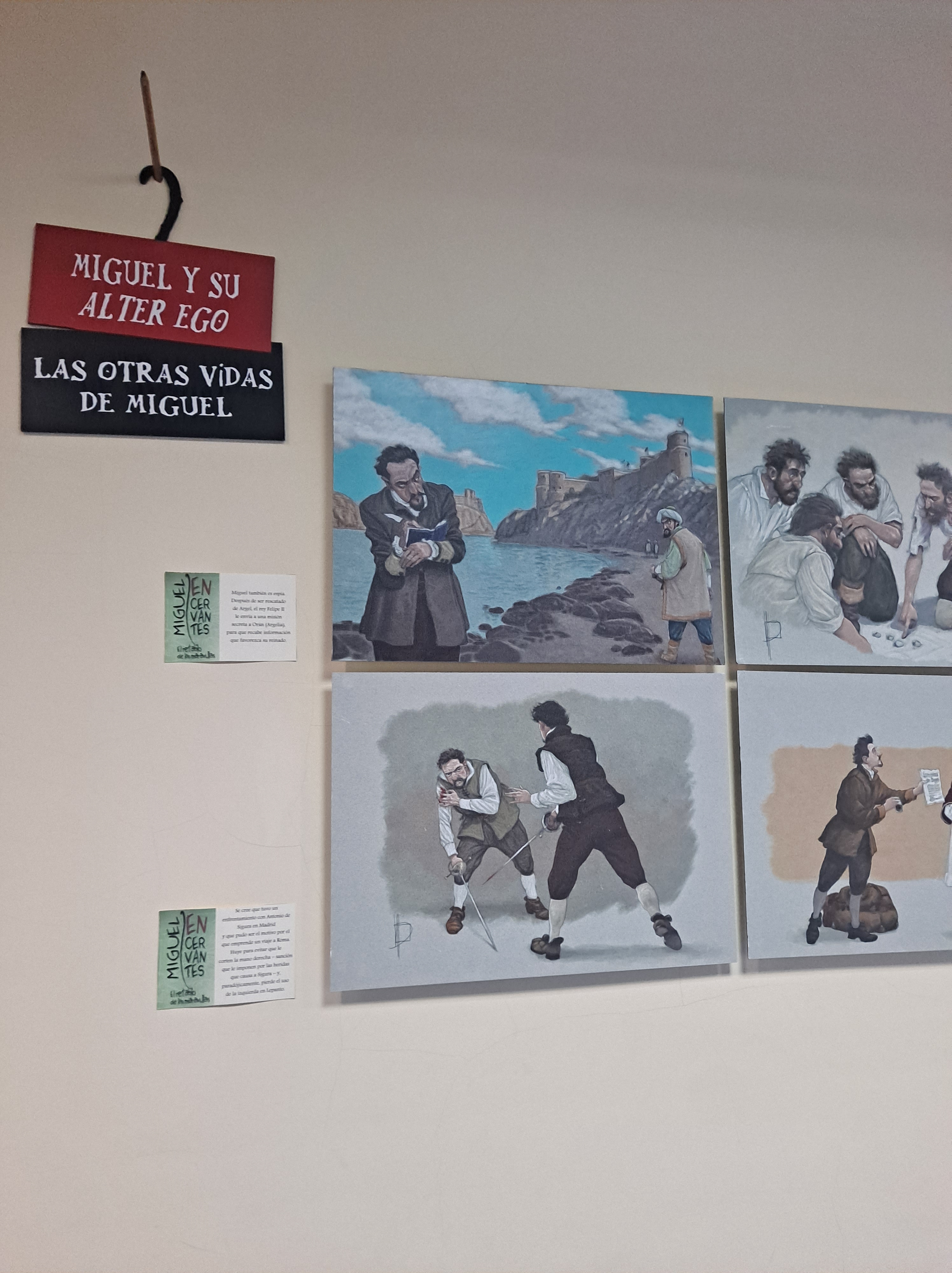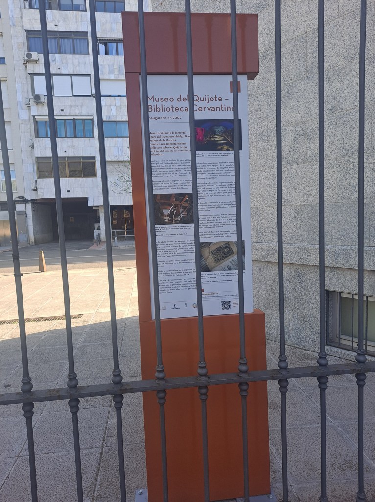 Luego hay una sala para sentarse que ponen un decorado en el suelo de arena y libros, y estanterías llenas de libros en las paredes, y una proyección en audio de un resumen del Quijote.