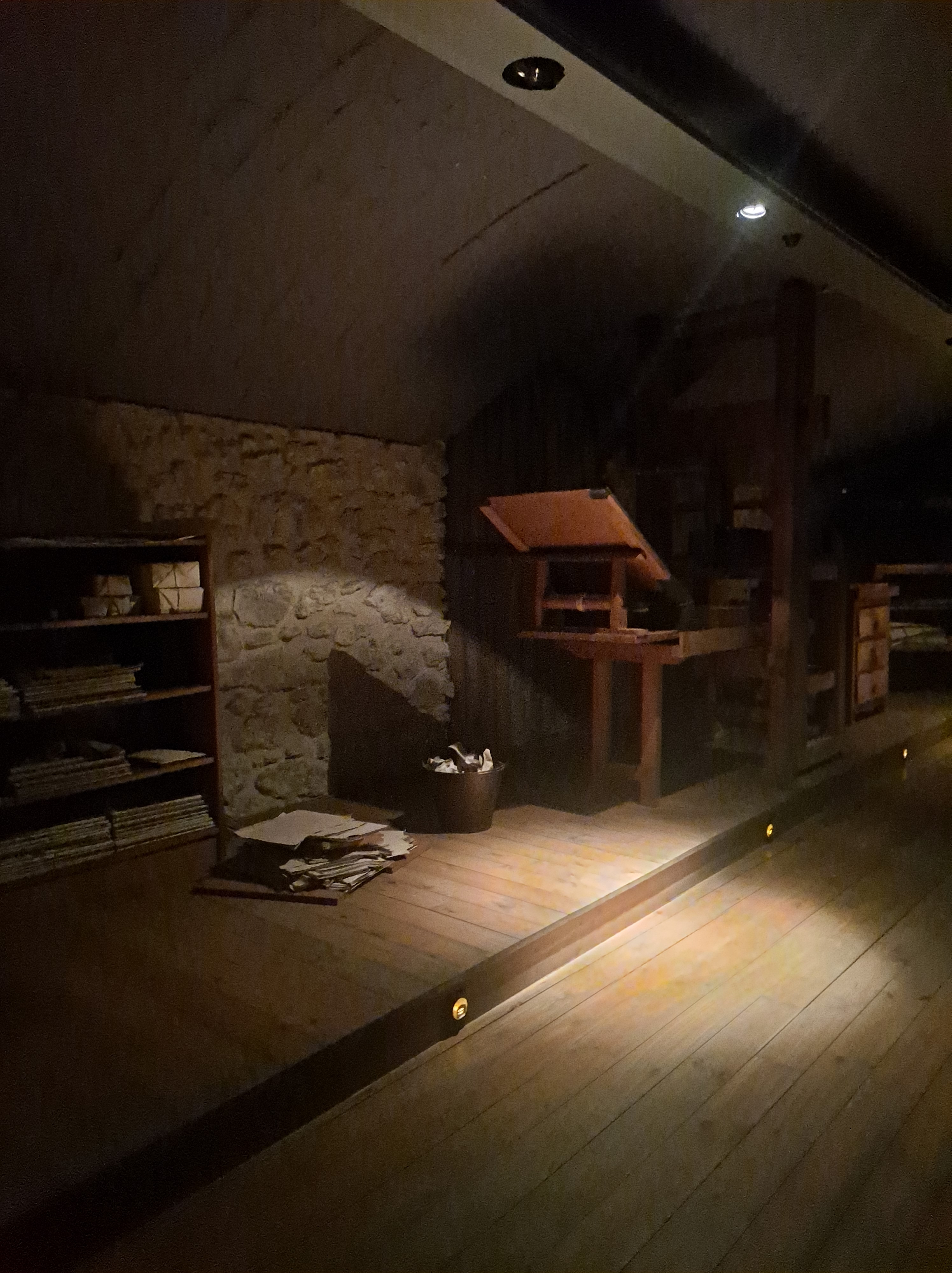 Museo del Quijote, parte audiovisual, decorada con audios de un señor que trabajó en la imprenta, van cambiando las luces a diferentes partes de la imprenta.