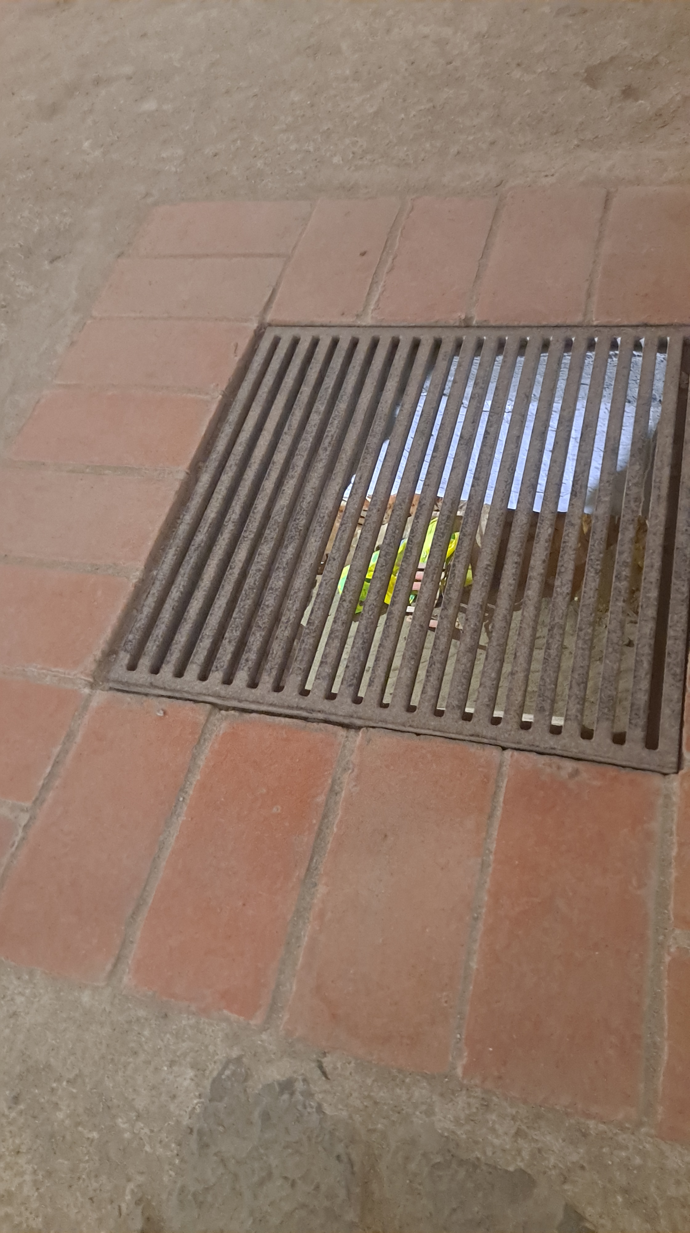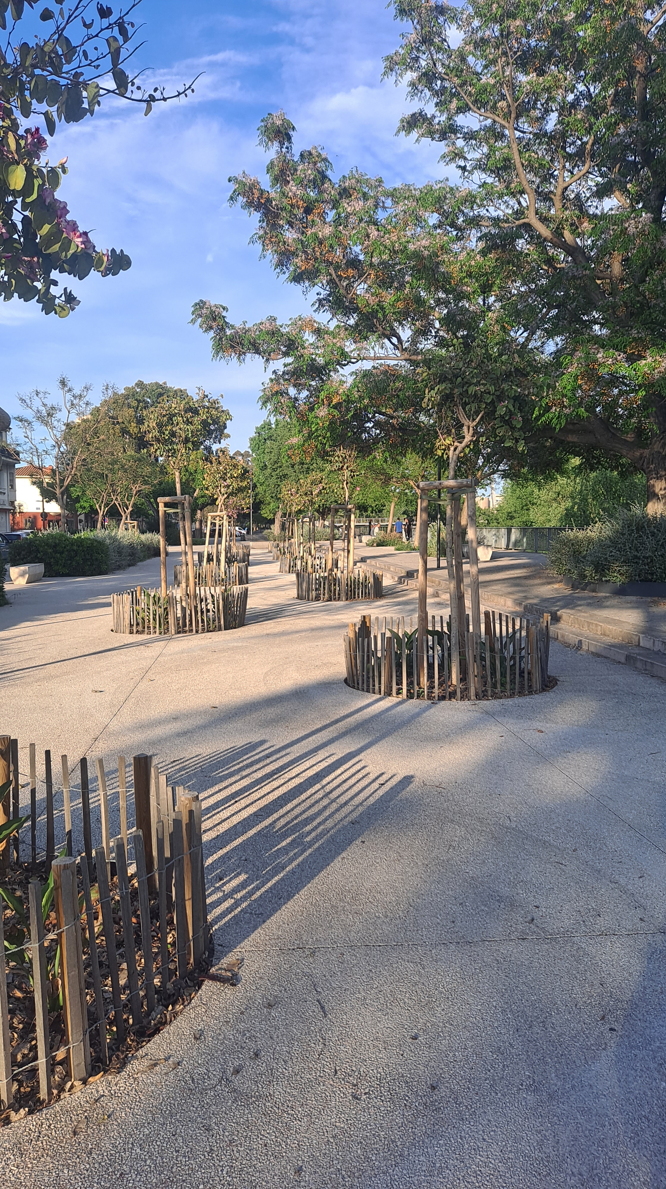 Las aceras están pavimentadas con esa aleación de goma y plástico acolchado aislante que se pone en el suelo de los parques para que si los niños se caen no se hagan daño, hay una zona entera pavimentada de esa manera, partes un poco más duras y otras como que puedes rebotar.