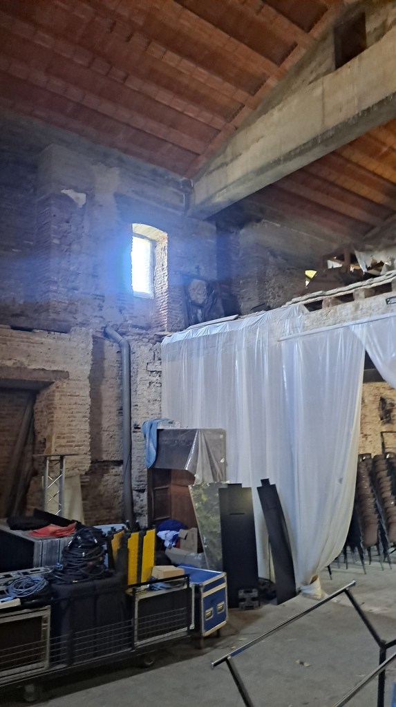 A uno de esos accesos medio cerrado accedí, y pudimos ver el backstage, el detrás de bambalinas parece un lugar de almacenamiento, y se hace raro ver cosas modernas en ése entorno.