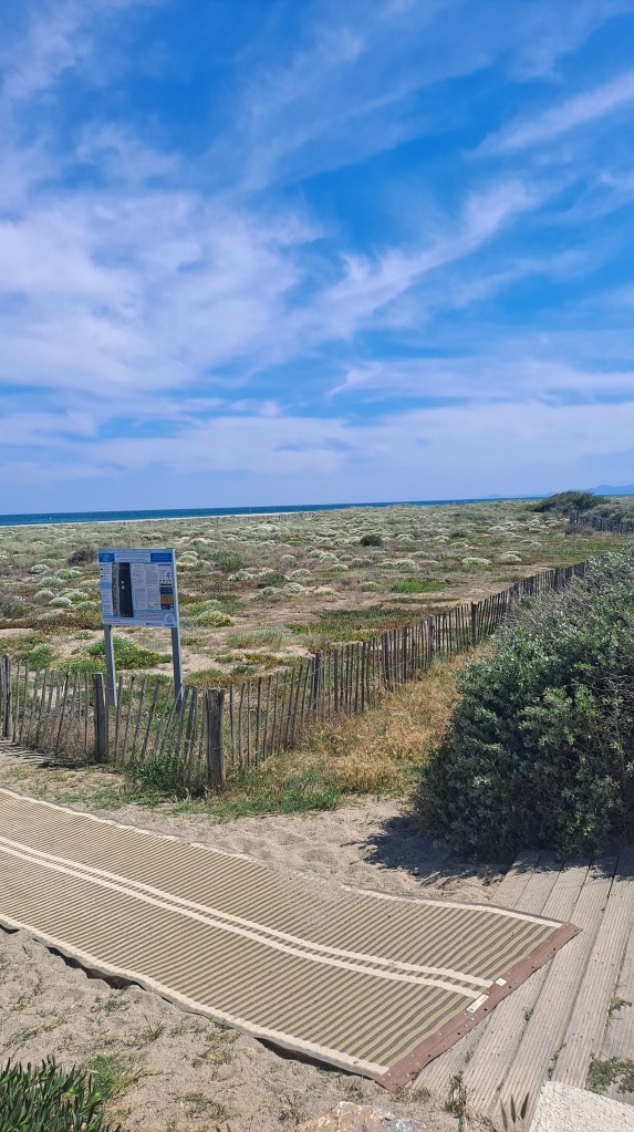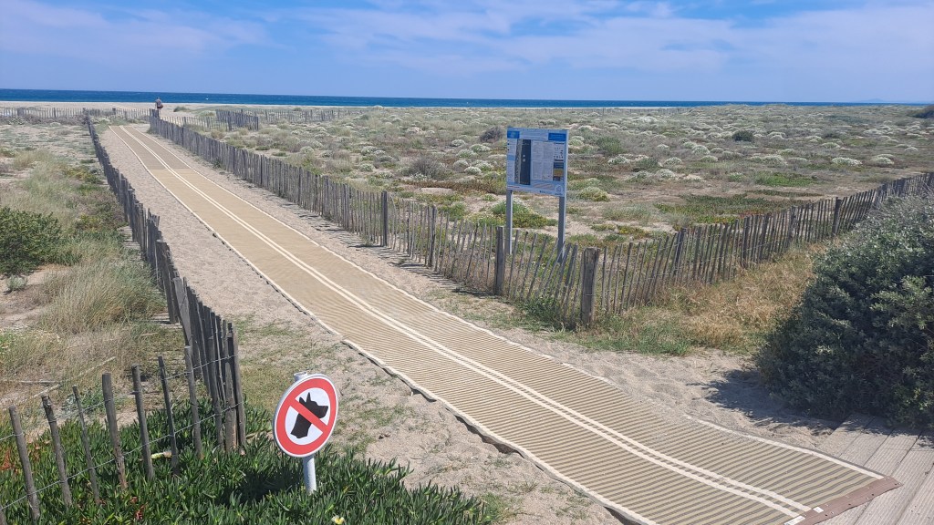 Para hacerlo más fácil ponen alfombrillas hasta casi el agua, como una pasarela, y un caminito de madera con banquetas al lado.
