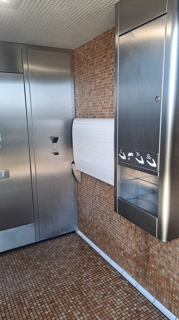 No hay baños inteligentes tan apañados, pero bueno, las paredes de baldosas y el suelo de imitación de madera, todo con un polvo de arena, está vez sin agua, aunque esté la instalacion pero no sale, papel sí pero no tan sofisticado, y eso sí sin tiempo alarmado y con lo mismo de que cuando te vas es cuando tira solo de la cadena.