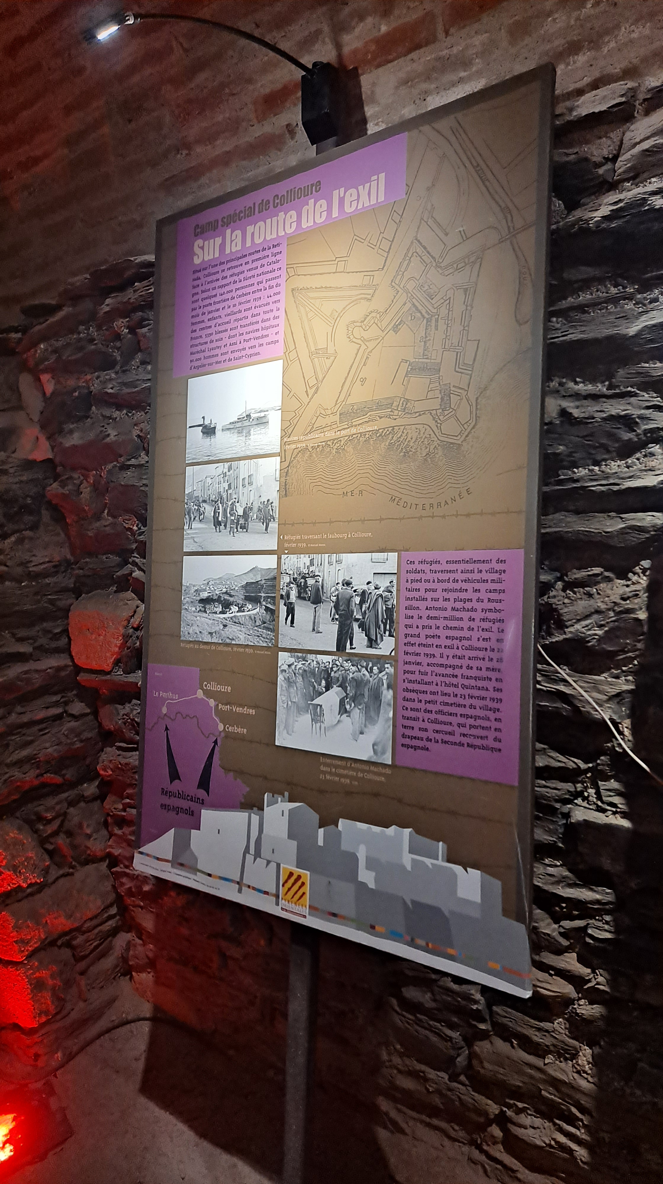 Compramos la entrada para el fuerte, es grande, se tarda bastante en recorrerlo, y tiene pasadizos subterráneos y calabozos. Además hay una exposición de los exiliados españoles a Francia, a Perpignan, con una especie de alcantarillas por donde se les escondía.