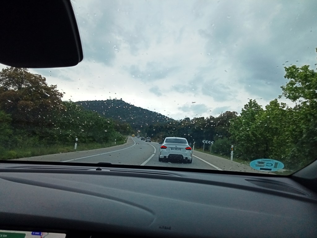 Salimos un Martes. Por el camino vimos un Bus de Basket del Zaragoza, la carretera por zonas largas tenía conos abierto carril reversible, al otro lado., por obras de reconstrucción del asfalto, lo vimos por la Muela.