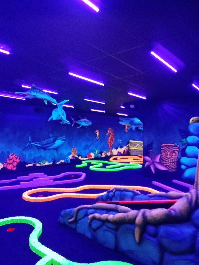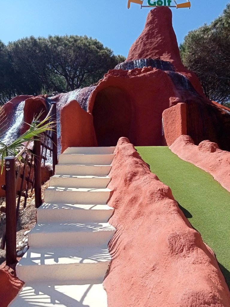 Luego fuimos a jugar al minigolf, estaba como en una zona medio remota con algunas cosas pero cerca de la autovía; que salió un poco caro, no sé si salieron cerca de 20 euros dos entradas, había zona exterior, con un mini chiringuito al lado de la caseta con muy poquinas cosas que se pueden tomar, y que se pagaban aparte.