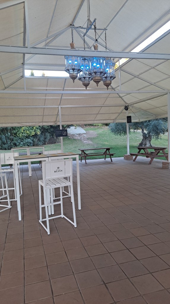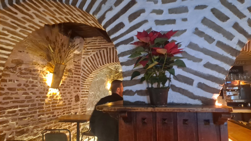 Por dentro adornado de arcos emulando estilo mezquita de Córdoba, y un patio cubierto para pocos comensales en la terraza interior.