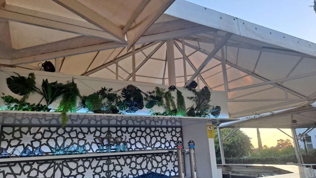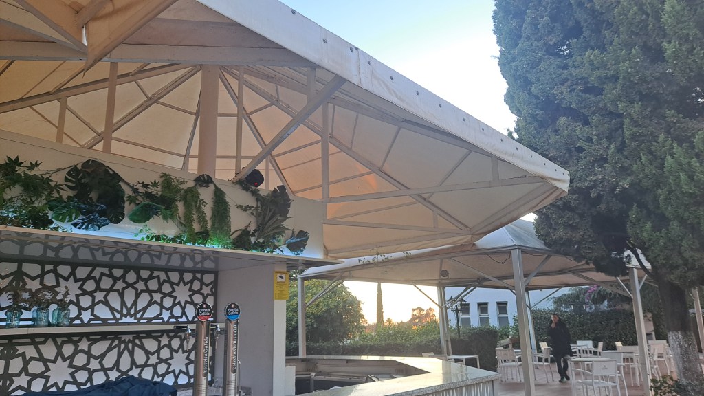 Pero ahí estaba, el aparcamiento exterior muy bueno y grande, y desde fuera ya se ve bien que tiene zona exterior de piscina, de terraza con comida exterior, césped y hasta una zona de chillout, pub, e incluso al fondo del todo una zona para hacer pádel, y otro aparcamiento como por detrás del complejo.