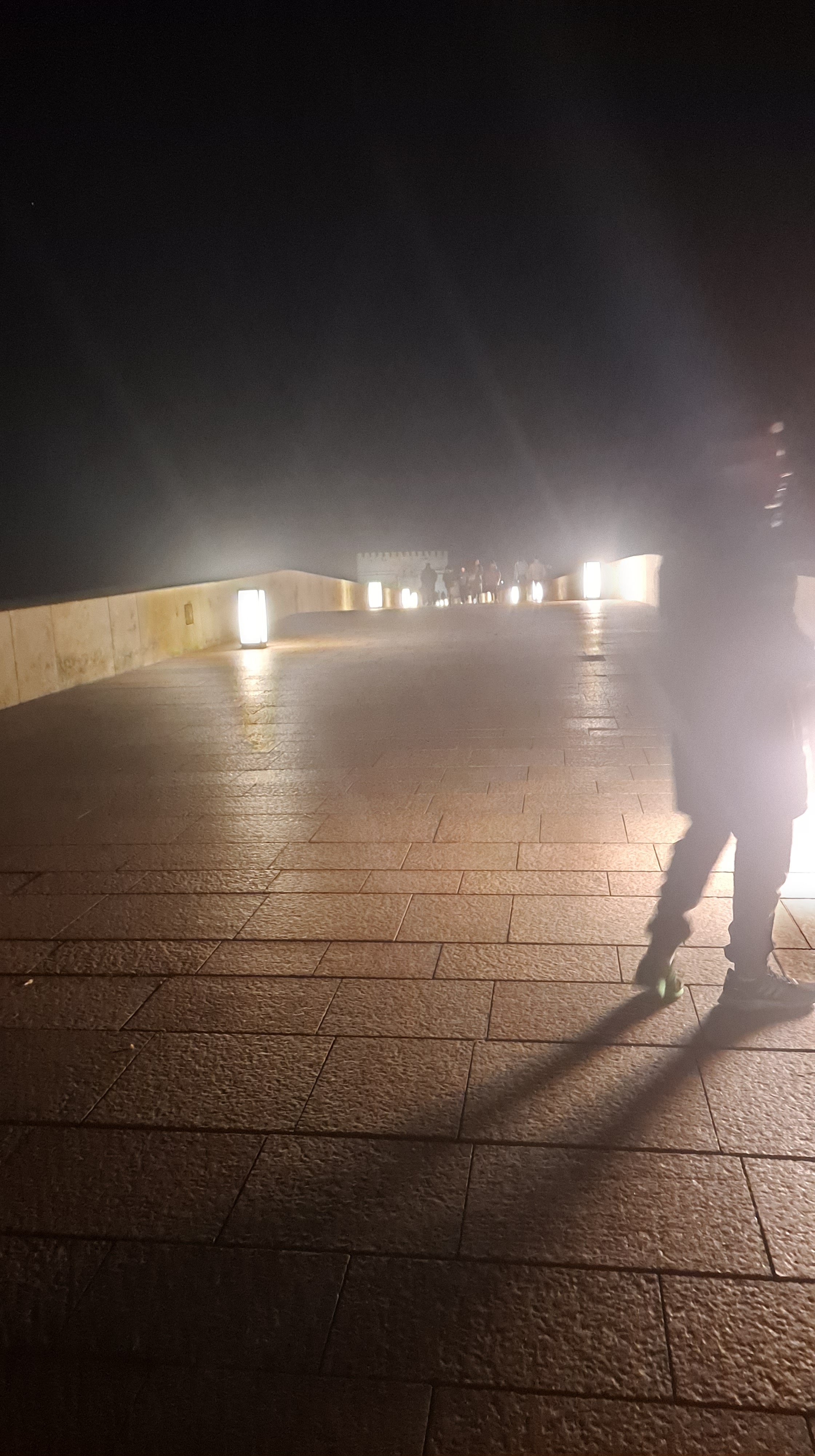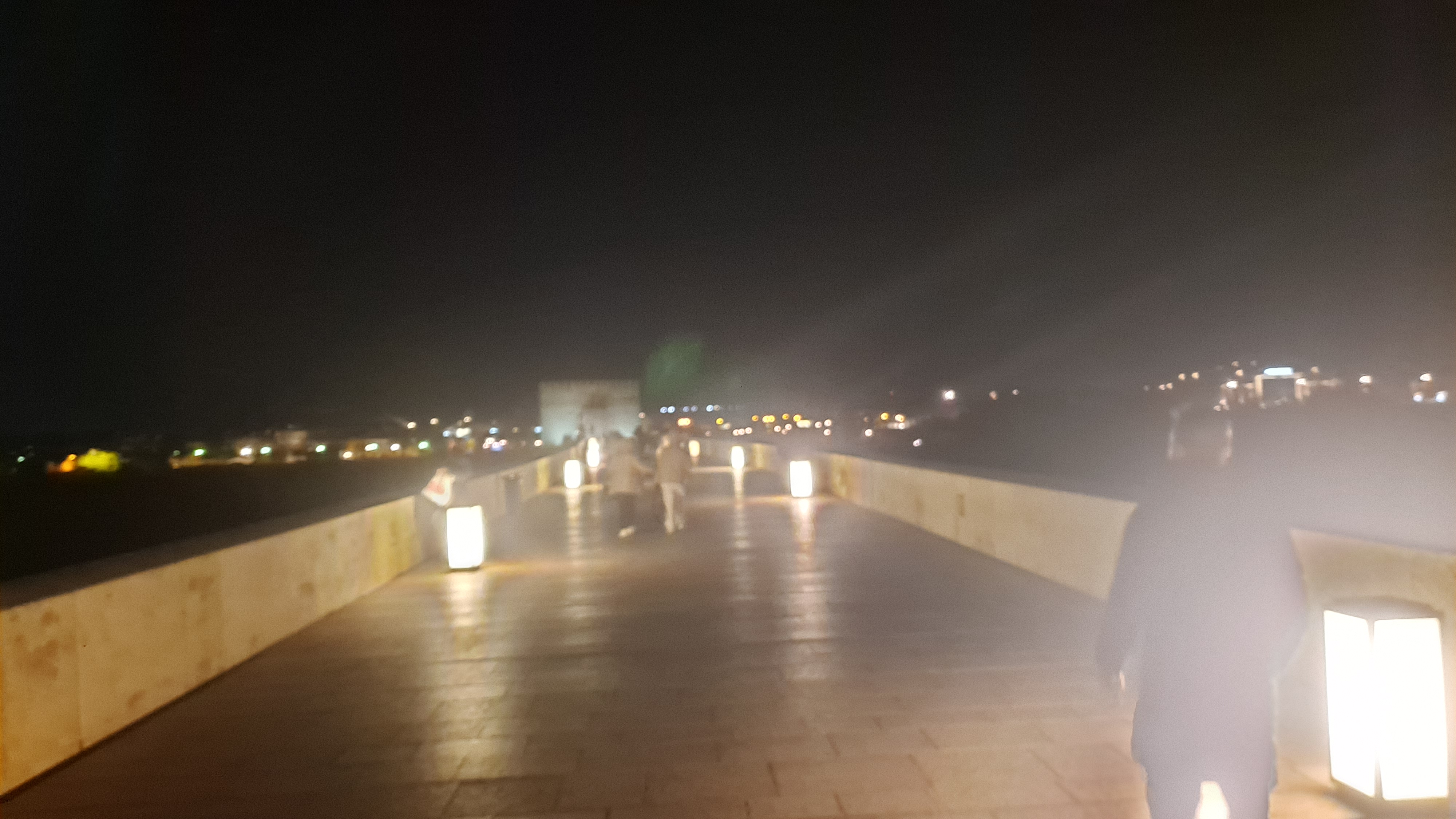 Dimos varias vueltas por el puente que conecta, de noche con la iluminación exterior.
