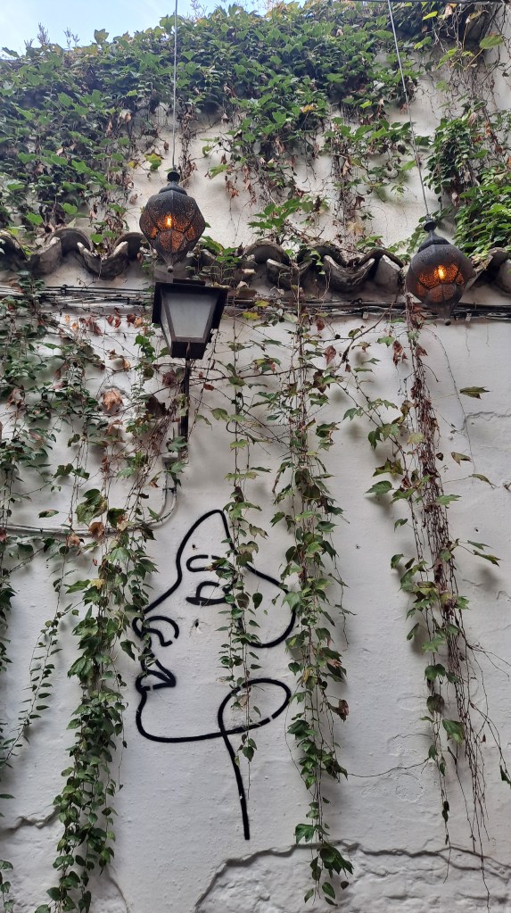 Un rinconcito encantador, con las enredaderas, y en neón el rostro de una mujer.