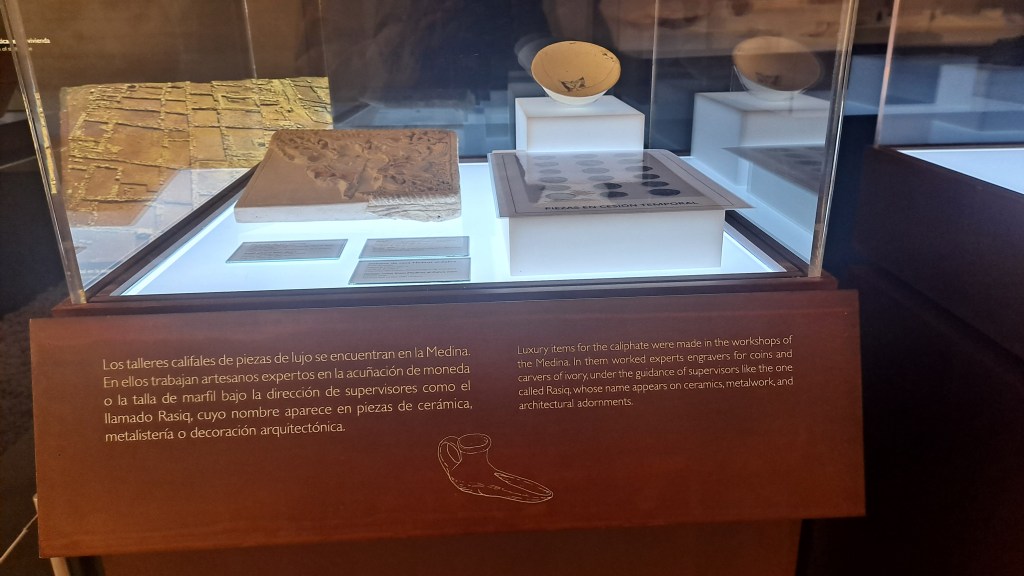 Podemos ver expuestas piezas de los talleres califales de piezas de lujo de la Medina, bajo la dirección y supervisación de Rasiq, piezas de cerámica, metalistería o decoración arquitectónica.